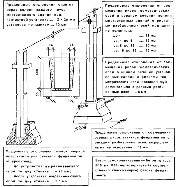 Соответствие планово-высотного положения фундаментов проектному в пределах требований нормативных документов отражается в актах промежуточной приемки фундаментов. При приемочном контроле фундаментов кроме исполнительных схем планово-высотного положения фундаментов должна быть представлена также следующая документация: - исполнительные чертежи с внесенными (при их наличии) отступлениями, допущенными предприятием-изготовителем фундаментов, а также монтажной организацией, согласованными с проектными организациями-разработчиками чертежей, и документы об их согласовании; - заводские паспорта на фундаменты; акты освидетельствования скрытых работ; акт промежуточной приемки фундаментов; журналы работ. Геодезические работы при монтаже колоннСНиП 3.01.01-85* Организация строительного производства. СНиП 3.01.03-84 Геодезические работы в строительстве. Пособие по производству геодезических работ в строительстве (к СНиП 3.01.03-84). ТЕХНИЧЕСКИЕ ТРЕБОВАНИЯ Детальные разбивочные работы при монтаже колонн должны выполняться в соответствии с требованиями проекта, СНиП 3.01.01-85*, СНиП 3.01.03-84, ППР, ППГР или другой технологической документации, утвержденной в установленном порядке. Для производства детальных разбивочных работ на исходном и монтажных горизонтах, а также для исполнительных съемок создается внутренняя разбивочная сеть здания (сооружения). Вид, схема, способ закрепления знаков внутренней разбивочной сети здания (сооружения) указываются в ППГР или геодезической части ППР. ППГР, геодезический раздел ППР или другая технологическая документация на монтаж колонн должны содержать: требования по точности создания внутренней разбивочной сети здания и точности выполнения детальных разбивочных работ; методику построения внутренней разбивочной сети здания и методы выполнения детальных разбивочных работ (технологию выноса и закрепления в натуре осей и отметок, определяющих в соответствии с требованиями проекта положение колонн в плане и по высоте, передачи сети с исходного на монтажные горизонты); технологию выверки колонн при установке их в проектное положение и технологию производства исполнительных съемок и составления исполнительской документации; схему расположения знаков внутренней разбивочной сети; график выполнения геодезических работ. Точность построения внутренней разбивочной сети здания следует принимать согласно нижеследующей таблице.