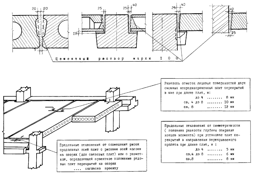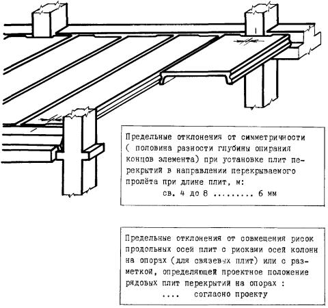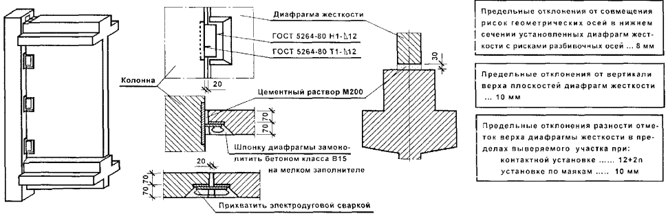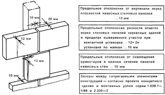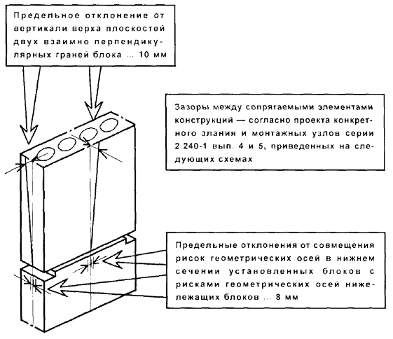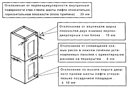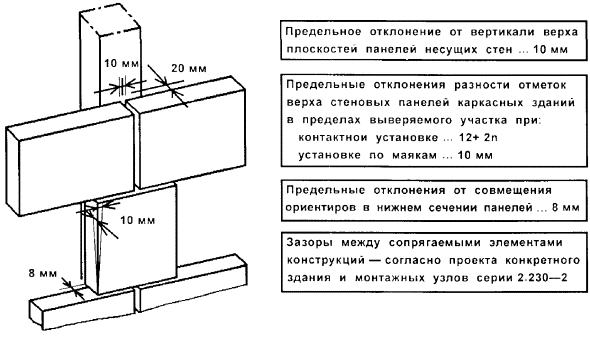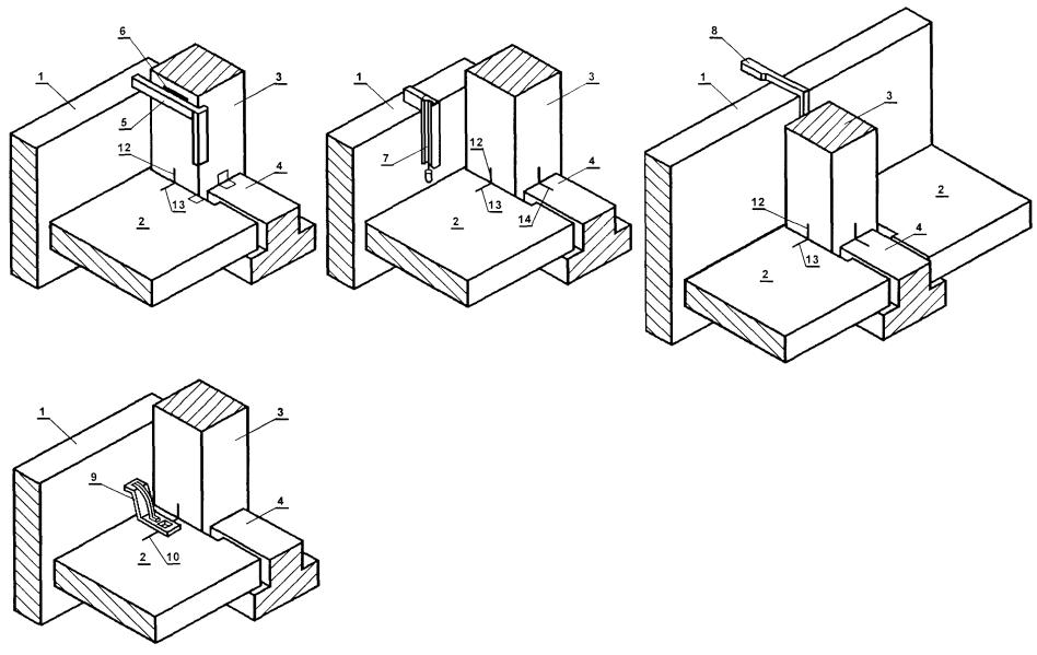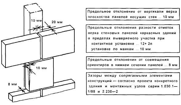 1 - стеновая панель; 2 - плита перекрытия пристенная; 3 - колонна; 4 - ригель; 5 - угловой шаблон; 6 - установочная риска высотной отметки; 7 - рейка-отвес; 8 - шаблон-калибр; 9 - шаблон; 10 - установочная (контрольная) риска; 11 - шаблон с вырезом; 12 - риски оси колонны; 13 - установочная риска; 14 - риска оси ригеля Высотное положение элементов монтажного горизонта: панелей перекрытий, верхних торцов наружных и внутренних панелей, лестничных площадок и лифтовых шахт определяют геометрическим нивелированием. На монтажном горизонте (в пределах захватки монтажа или между температурными швами) нивелируют все опорные площадки под установку последующих элементов. Пятку рейки устанавливают на четырех углах панелей перекрытий, на выступ наружных стеновых панелей, на верхний торец объемных элементов лифтовых шахт. За исходную точку нивелирования принимают один из рабочих реперов. Отсчеты по рейке, устанавливаемой на рабочий репер в начале и по завершении нивелирования, производят по черной и красной сторонам. Разность отсчетов по рейке в начале и по завершении нивелирования не должна быть более 5 мм. Определение отметок монтажного горизонта производится от рабочих реперов монтажного горизонта со средней квадратичной погрешностью, не превышающей 2 мм. Средняя квадратическая погрешность установки двух смежных маяков допускается не более 2 мм, а в пределах одной секции (захватки) - 3 мм. Местоположение лифтовых шахт определяется промерами от монтажных рисок или разбивочных осей. В процессе строительства шахты контролируют ее внутренние размеры и вертикальность ствола. Размеры диагоналей проверяют стальной рулеткой, вертикальность - с помощью отвеса, оптических центриров или лазерных приборов вертикального проектирования. Результаты геодезической (инструментальной) проверки при операционном контроле должны быть зафиксированы в общем журнале работ. Исполнительные геодезические съемки выполняются организациями, осуществляющими строительно-монтажные работы. Места, точки, параметры, методы, порядок проведения и объем съемок должны быть установлены в проектной документации или в ППР (ППГР). В качестве исходной геодезической основы для исполнительной съемки принимаются знаки геодезической разбивочной основы для строительства, знаки закрепления осей, монтажные риски на конструкциях. До начала съемки необходимо проверить сохранность и неизменность положения знаков исходной основы и в случае необходимости восстановить утерянные знаки. Зазоры (расстояния) между элементами, длины площадок опирания монтируемых элементов, несоосности элементов или несовпадения поверхностей, невертикальности следует проверять непосредственным измерением расстояний между осями или гранями. Для составления исполнительных схем по результатам съемок используют рабочие чертежи проектов. В составе проектов должны выпускаться дополнительные листы (планы этажей и т.п.), на которые наносятся данные исполнительной съемки. В каркасных зданиях производится исполнительная съемка в плане: колонн, ригелей, балок, связевых и пристенных плит, диафрагм жесткости, вентиляционных блоков-диафрагм жесткости, лифтовых шахт и т.д. По высоте следует определять горизонтальность опорных плоскостей (оголовков) колонн в пределах между температурными швами, навесных панелей наруж