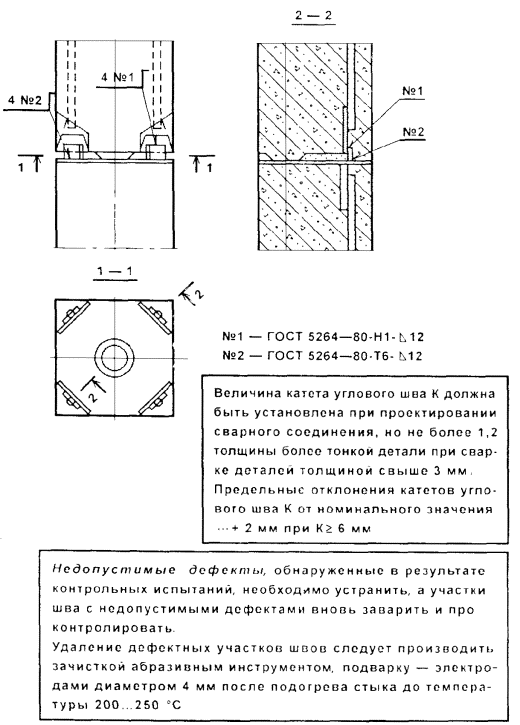Колебания напряжения питающей сети электрического тока, к которой подключено сварочное оборудование, не должны превышать ± 5 % номинального значения. Оборудование для ручной многопостовой сварки следует питать от отдельного фидера. Покрытые электроды должны соответствовать требованиям проекта, ГОСТ 9467-75*, ГОСТ 9466-75*, требованиям технических условий на электроды конкретных видов и марок, предусмотренных проектом. Требования ко входному контролю электродов и их подготовке к производству сварочных работ приведены в СОКК «Подготовка сварочных материалов». Для ручной дуговой сварки следует использовать источники постоянного сварочного тока универсальные или с падающей характеристикой и сварочные трансформаторы на токи до 500 А. Перед сборкой конструкций необходимо установить соответствие чертежам марок стали плоских закладных изделий и соединительных деталей, перед сваркой - также размеров и точности сопряжения соединительных элементов. Отклонение от плоскостности наружных лицевых поверхностей плоских элементов закладных изделий не должно превышать 3 мм. Кромки свариваемых элементов в местах расположения швов и прилегающие к ним поверхности шириной не менее 20 мм, а также места примыкания начальных и выводных планок необходимо зачищать с удалением ржавчины, жиров, краски, грязи, влаги и т.п. Кромки плоских элементов после огневой резки должны быть очищены от грата, шлака, брызг и наплывов. Для выполнения монтажных соединений из стального проката следует применять электроды, указанные в проекте (для марки стали ВСт3сп и ВСт3пс - электроды типа Э42, Э46, Э42А, Э46А согласно СНиП II-23-81, табл. 55). Ручную дуговую сварку плоских закладных изделий разрешается выполнять без подогрева при температуре окружающего воздуха до минус 30 °С для углеродистой стали толщиной до 16 мм и до минус 20 °С для углеродистой стали толщиной свыше 16 до 30 мм. Поверхности свариваемой конструкции и выполненных швов сварных соединений после окончания сварки необходимо очищать от шлака, брызг и наплывов (натеков) расплавленного металла. Наплавленный металл не должен иметь видимых при внешнем осмотре трещин. Трещины всех видов и размеров должны быть устранены с последующей заваркой и контролем. Поверхность швов должна быть равномерно-чешуйчатой, без прожогов, наплывов, сужений и перерывов. Переход от наплавленного металла к основному должен быть плавным, глубина подрезов основного металла - до 5 % толщины свариваемого проката, но не более 1 мм. Глубина допускаемых одиночных дефектов - до 10 % толщины свариваемого проката, но не более 3 мм, длина - до 20 % длины оценочного участка (15, 20 и 25 мм для наименьшей толщины элемента в сварном соединении, соответственно, от 4 до 6, св. 6 до 10, св. 10 до 20 мм). Глубина допускаемых дефектов в виде цепочки или скоплений - до 5 % толщины свариваемого проката, но не более 2 мм, длина - не более удвоенной длины оценочного участка; допустимое расстояние между близлежащими концами соседних по длине шва дефектов (непроваров, цепочек и скоплений пор) - не менее 200 мм. Обнаруженные в результате внешнего осмотра недопустимые дефекты необходимо исправить и вновь проконтролировать. После исправления недопустимых дефектов, обнаруженных внешним осмотром, осуществляется контроль швов неразрушающими методами в объеме не менее 0,5 % длины швов. Контролю 