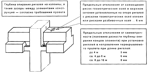 Если проектные высоты колонн различны, то величины, откладываемые для их маркировки, также принимают разными с таким расчетом, чтобы была возможность нивелировать все маркированные риски после установки колонн в стаканы. Для нивелировки консолей невысоких колонн (до 5 - 6 м) применяют уголки, надежно скрепленные с нивелирной рейкой. Результаты геодезического контроля заносятся в журнал геодезического контроля и оформляются исполнительной геодезической схемой планово-высотного положения смонтированных колонн. При приемке смонтированных и окончательно закрепленных колонн производятся исполнительные съемки планового и высотного положения колонн. В качестве исходной геодезической основы для исполнительной съемки принимаются знаки геодезической разбивочной основы для строительства, знаки закрепления осей, монтажные риски. До начала съемки проверяют неизменность положения и сохранность знаков исходной основы. При необходимости восстанавливают утерянные знаки. В каркасных зданиях производится исполнительная съемка: в плане - колонн; по высоте - горизонтальности опорных плоскостей (оголовков) колонн в пределах между температурными швами. На исполнительной схеме, оформляемой по результатам исполнительной съемки, фиксируются отклонения, смещения и разности отметок в сравнении с проектными величинами. Отклонения, смещения и разности отметок, зафиксированные в процессе съемки, сравниваются с допусками, регламентированными СНиП 3.03.01-87 «Несущие и ограждающие конструкции». Исполнительная геодезическая схема входит в состав документации по приемке смонтированных колонн. Монтаж колонн в стаканы фундаментовГОСТ 18979-90 Колонны железобетонные для многоэтажных зданий. Технические условия. ТУ 5821-003-03984416-99 Колонны сборные железобетонные. .......................... Технические условия на колонны, предусмотренные проектом. Серия 1.020-1/87, выпуск 6-1 Монтажные узлы. Сопряжения колонн с ригелями высотой 450 мм. СНиП 3.03.01-87 Несущие и ограждающие конструкции. ТЕХНИЧЕСКИЕ ТРЕБОВАНИЯ Входной контроль качества железобетонных колони должен осуществляться в соответствии с требованиями проекта, СНиП 3.01.01-85*, ГОСТ 13015.0-83*, ГОСТ 13015.3-81*, ГОСТ 18979-90, технических условий и технологической документации, утвержденной в установленном порядке. ГОСТ 18979-90 Колонны железобетонные для многоэтажных зданий. Технические условия Поставленные на монтаж колонны не должны иметь: - жировых и ржавых пятен на лицевых поверхностях; - трещин на внешней поверхности колонн, за исключением местных поверхностных усадочных, ширина которых не должна превышать 0,1 мм; - наплывов бетона на открытых поверхностях стальных закладных изделий, выпусках арматуры и монтажных петлях. Значения действительных отклонений геометрических параметров колонн не должны превышать предельных, мм, указанных в нижеследующей таблице.
