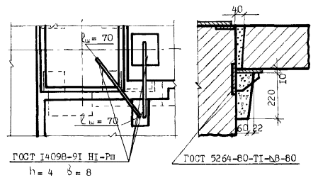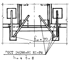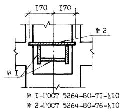 При отсутствии электродов типов Э55 и Э60 дуговую сварку многослойными швами стали класса A-III, Ат-IIIC и Ат-IVC допускается выполнять электродами Э50А. Для ручной дуговой сварки следует использовать источники постоянного сварочного тока универсальные или с падающей характеристикой и сварочные трансформаторы на токи до 500А. Перед сборкой конструкций необходимо установить соответствие чертежам КЖ классов стержневой арматуры, марок стали плоских закладных изделий и соединительных деталей, а перед сваркой - также размеров и точности сопряжения соединительных элементов. РУЧНАЯ ДУГОВАЯ СВАРКА ТАВРОВЫХ СОЕДИНЕНИЙ В ВЫШТАМПОВАННОЕ ОТВЕРСТИЕ Т9-Рв
