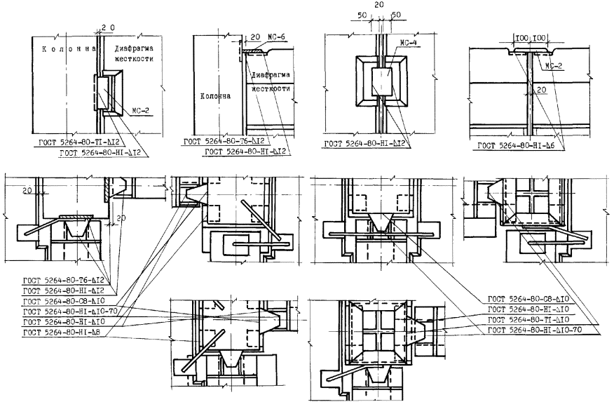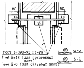 Средние значения предела прочности С сварных соединений приведены в СОКК 6 «Ручная дуговая сварка». Контроль соответствия качества выполненных сварных соединений арматуры должен предусматривать внешний осмотр и комплекс испытаний, проводимых в соответствии с ГОСТ 10922-90 и ГОСТ 23858-79. Сварные соединения арматуры, не удовлетворяющие требованиям этих стандартов, необходимо вырезать. На место вырезанного стыка следует вварить промежуточную вставку длиной не менее 80 мм с последующим ультразвуковым контролем двух выполненных сварных соединений. Подварку допускаемых к исправлению дефектов следует производить электродами диаметром 4 мм после зачистки места дефекта абразивным инструментом и предварительного подогрева стыка до 200 - 250 °С. Бетонирование конструкции до получения результатов оценки качества сварных соединений не разрешается. Результаты визуального осмотра и измерений должны быть оформлены актом. Приемку сварных соединений следует осуществлять партиями. Партия сварных стыковых соединений выпусков стержней арматуры должна состоять из соединений арматурной стали одного класса и диаметра, выполненных одним сварщиком по единой технологии. Допускается включать в одну партию соединения, выполненные несколькими сварщиками, при наличии исполнительной схемы сварки или их личного клейма на соединениях, а также соединения стержней, отличающихся по диаметру не более чем на один номер профиля арматуры. В одну партию включаются соединения, выполненные протяженными швами. Объем партии соединении не должен превышать 200 соединений. Не менее 10 % из них отбираются для визуального осмотра и измерений. Если хотя бы одно соединение не будет соответствовать предъявленным требованиям, то проводят повторную проверку удвоенного числа соединений, а затем при аналогичных результатах переходят к поштучной приемке и исправлению. Сварка стыков колонн сечением 300 ´ 300 каркаса серии 1.020.1-7ГОСТ 9467-75* Электроды покрытые металлические для ручной дуговой сварки конструкционных и теплоустойчивых сталей. Типы. ГОСТ 9466-75* Электроды покрытые металлические для ручной дуговой сварки сталей и наплавки. Классификация и общие технические условия. СНиП 3.03.01-87 Несущие и ограждающие конструкции. ГОСТ 14098-91 Соединения сварные арматуры и закладных изделий железобетонных конструкций. Типы, конструкция и размеры. ГОСТ 10922-90 Арматурные и закладные изделия сварные, соединения сварные арматуры и закладных изделий железобетонных конструкций. Общие технические условия. ГОСТ 23858-79 Соединения сварные стыковые и тавровые арматуры железобетонных конструкций. Ультразвуковые методы контроля качества. Правила приемки. Требования к электродам, Монтажные и сварочные узлыВходной контроль качества электродов должен осуществляться в соответствии с требованиями проекта, СНиП 3.01.01-85*, ГОСТ 24297-87, ГОСТ 9467-75*, ГОСТ 9466-75*, требованиями технических условий на электроды конкретных видов и марок, предусмотренных проектом, требованиями ППР (ППСР), технологических карт и другой технологической документации, утвержденной в установленном порядке. Покрытие электродов должно быть плотным, прочным, без вздутий, пор, наплывов, трещин, за исключением поверхностных продольных трещин и местных сетчатых растрескиваний, протяженность которых не превышает 3-кратный номинальный ди