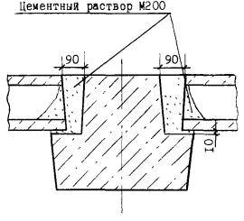 1 - проволоки (лески), фиксирующие оси; 2 - отвес; 3 - колышки, закрепляющие точки пересечения осей; 4 - местоположение фундаментной плиты Предельные отклонения от совмещения ориентиров при установке фундаментов стаканного типа должны быть указаны в проекте. При отсутствии в проекте специальных указаний предельные отклонения положения фундаментов от проектных не должны превышать по СНиП 3.03.01-87 следующих величин: - отклонение от совмещения установочных ориентиров фундаментных блоков и стаканов фундаментов с рисками разбивочных осей 12 мм (контроль измерительный, каждый фундамент, регистрация отклонений в геодезической исполнительной схеме); - отклонение отметок опорной поверхности дна стакана фундаментов от проектных до устройства выравнивающего слоя по дну стакана минус 20 мм (контроль измерительный, каждый фундамент, регистрация отклонений в геодезической исполнительной схеме). Правильность установки фундаментов проверяется теодолитом по двум взаимно перпендикулярным осям, закрепленным на обноске, и нивелиром. По окончании устройства фундаментов производится исполнительная геодезическая съемка планового и высотного положения фундаментов, по результатам которой составляется планово-высотная исполнительная схема, которая входит в состав исполнительной документации при приемке работ по устройству фундаментов. При исполнительной съемке сборных фундаментов стаканного типа проверяют непосредственными промерами рулеткой или измерительной линейкой длину и ширину стаканов, а также смещение осей стаканов фундаментов относительно разбивочных осей. Для таких измерений можно воспользоваться теодолитом и измерительной линейкой (нивелирной рейкой). При этом зрительную трубу теодолита направляют по осевому створу, а по вертикальной нити берут отсчеты по линейке (нивелирной рейке), которая должна прикладываться нулевым делением к граням стакана и располагаться перпендикулярно линии визирования. Разность между полученным отсчетом и проектной величиной и будет характеризовать величину действительного отклонения оси стакана от разбивочной оси. Отклонения отметок опорной поверхности дна стаканов фундаментов от проектных проверяется геометрическим нивелированием. С этой целью определяют отметки дна стаканов до устройства выравнивающего цементно-песчаного слоя или армобетонных прокладок по дну стакана и после. Сравнивая полученные отметки с проектными, получают действительные отклонения, которые не должны превышать предельных отклонений, установленных нормативными документами.