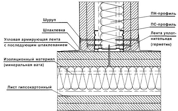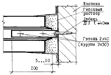 - выполняется разметка и к бетонным, кирпичным и т.п. конструкциям крепятся верхние и нижние направляющие профили с помощью дюбелей «ДГП» с шагом 500 мм (точка забивки дюбеля должна отстоять от края строительного основания на расстояние не менее 100 мм);