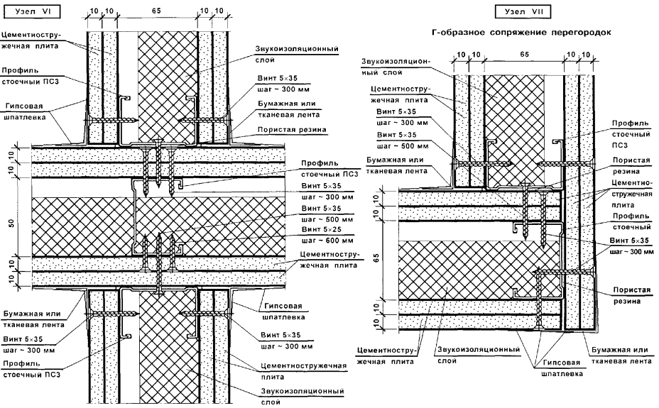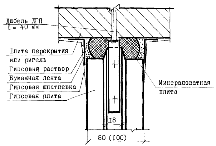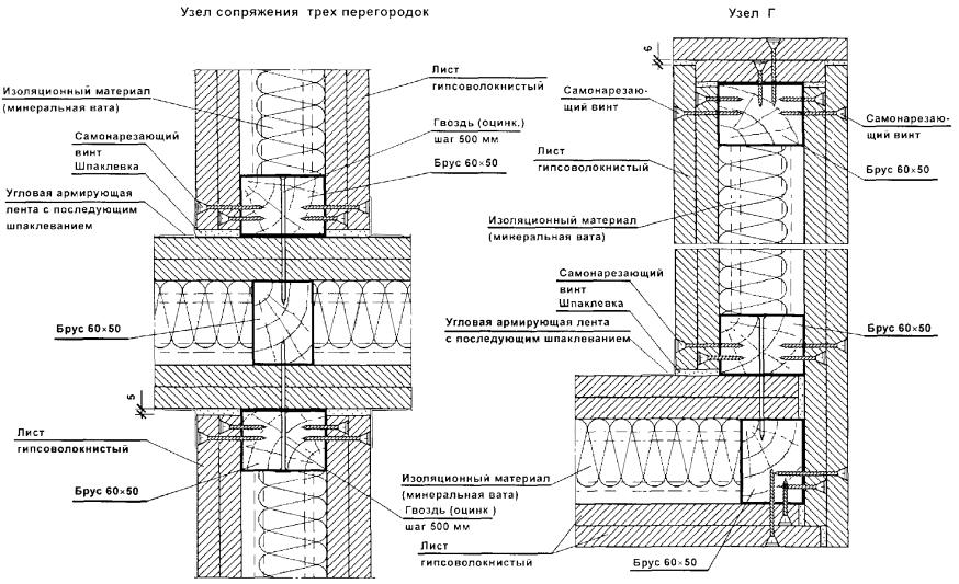 Для повышения звукоизоляции перегородок предусмотрены прошивные минераловатные звукопоглощающие маты g = 125 кг/м3 по ТУ 21-РСФСР-1.301-86 или полужесткие минераловатные плиты толщиной 50 мм g = 125 кг/м3 на синтетической связке по ГОСТ 9573-96.