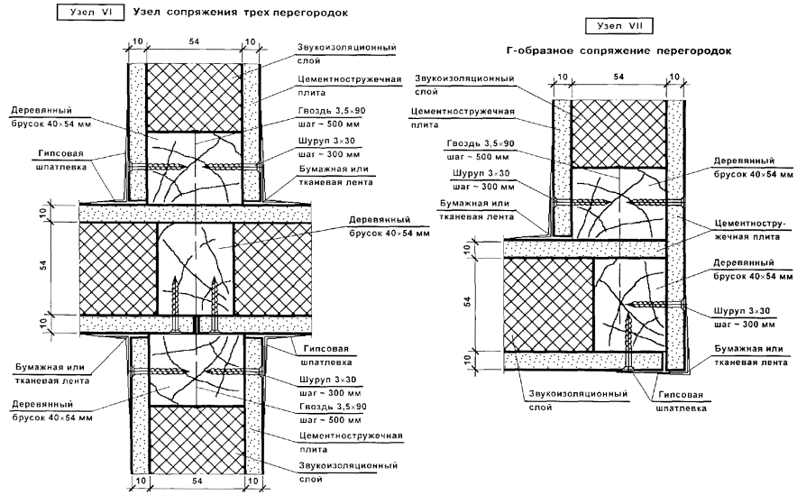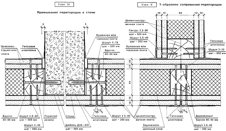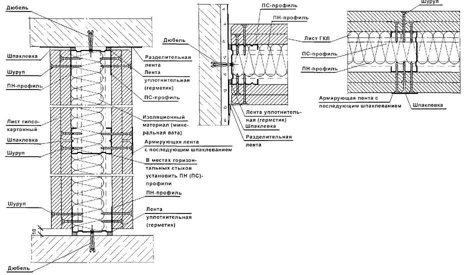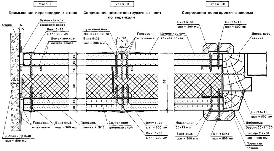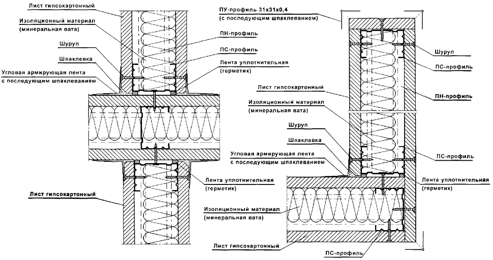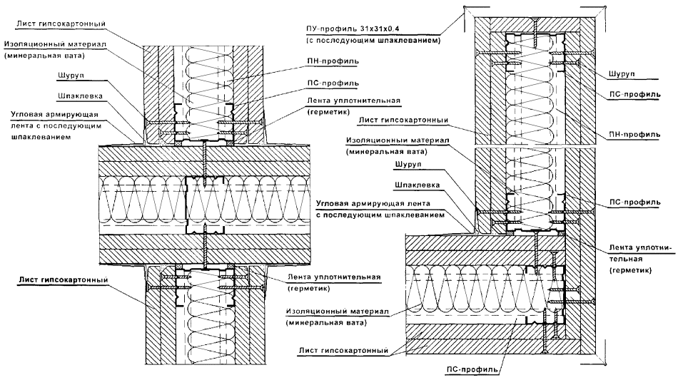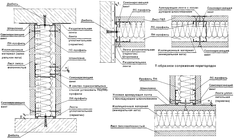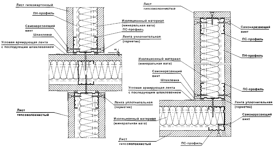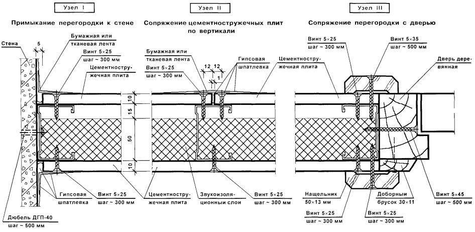 Перегородки поэлементной сборки представляют собой каркасную конструкцию, обшитую с двух сторон цементностружечными плитами (ЦСП). Каркас перегородок (вертикальные стойки и горизонтальные направляющие) следует монтировать из гнутых профилей, изготовленных путем профилирования рулонной тонколистовой оцинкованной стали на профилегибочных станках. Толщина стали - 0,5 и 0,6 мм.