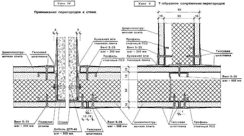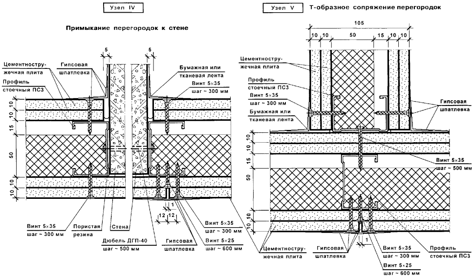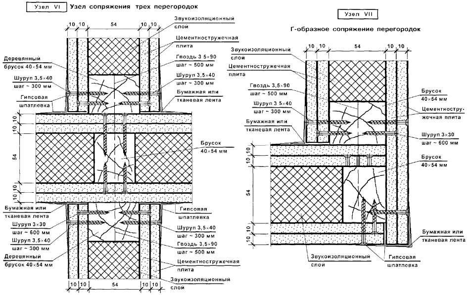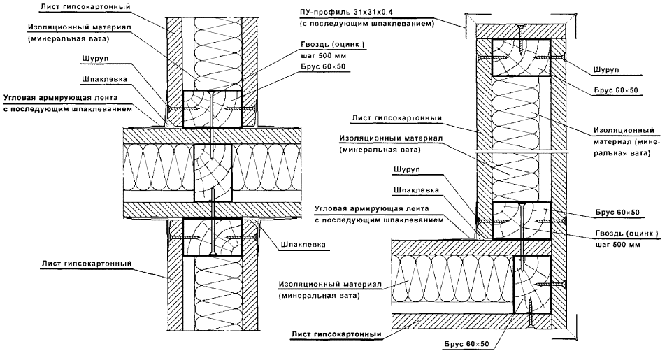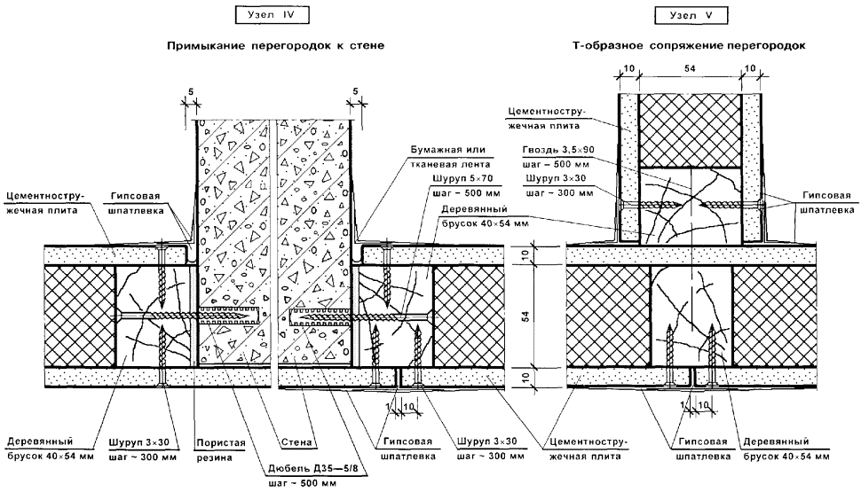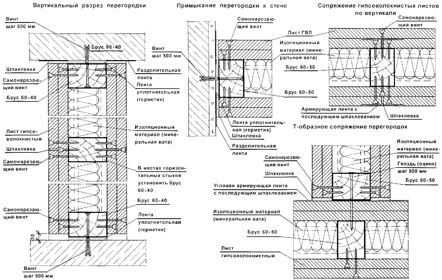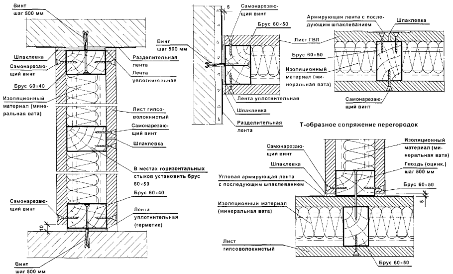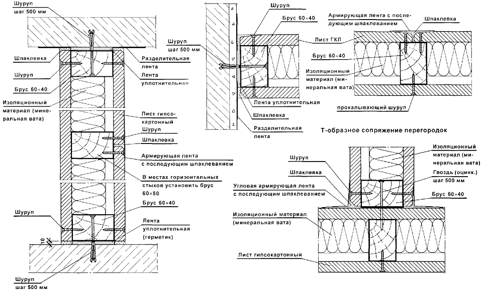 Перегородки поэлементной сборки представляют собой каркасную конструкцию, обшитую с двух сторон цементностружечными плитами (ЦСП). Каркас перегородок (вертикальные стойки и горизонтальные направляющие) следует монтировать из гнутых профилей, изготовленных путем профилирования рулонной тонколистовой оцинкованной стали на профилегибочных станках. Толщина стали - 0,5 и 0,6 мм.