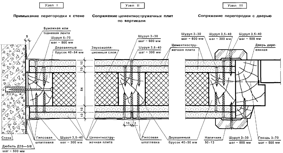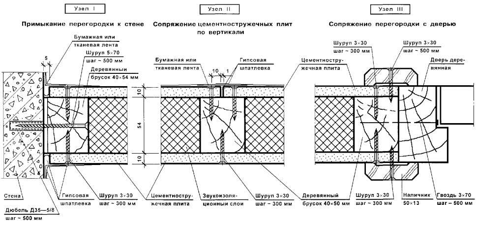 - с одной из сторон каркаса устанавливаются и крепятся шурупами цементностружечные плиты; устанавливаются и крепятся к стойкам каркаса стандартные дверные коробки;