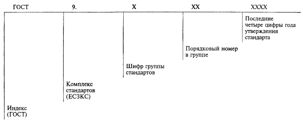 Примечание - В состав ЕСЗКС не входят межгосударственные стандарты по защите конкретных видов техники, а также стандарты следующих видов: - материалы, применяемые для защиты от коррозии, старения и биоповреждений (лакокрасочные, химикаты и реактивы, консервационные масла и смазки, ингибиторы, осушители, противостарители, биоциды и др.); - технологическое и испытательное оборудование; - приборы контроля и измерений. 4 Наименование и обозначение стандартов ЕСЗКС4.1 Наименование стандартов ЕСЗКС состоит из группового заголовка - краткого наименования системы: «Единая система защиты от коррозии и старения»; заголовка, отражающего объект стандартизации конкретной группы стандартов по таблице, и подзаголовка, характеризирующего вид стандарта по 3.2. Например: «ЕДИНАЯ СИСТЕМА ЗАЩИТЫ ОТ КОРРОЗИИ И СТАРЕНИЯ Основные положения» или «Единая система защиты от коррозии и старения ПОКРЫТИЯ МЕТАЛЛИЧЕСКИЕ И НЕМЕТАЛЛИЧЕСКИЕ Общие требования». 4.2 Обозначение стандартов ЕСЗКС строится по классификационному признаку. Регистрационный номер должен начинаться с цифры 9, определяющей комплекс стандартов ЕСЗКС, после точки записывают шифр группы, указанный в таблице, затем проставляется порядковый номер стандарта в данной группе. Порядок обозначения государственного стандарта ЕСЗКС: