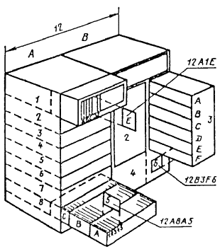Например, = А12 ≠ Т8 + 204 - K4Н : 12 (3.16 +15 : 2). Контакт 12 сигнального реле К4, которое расположено на месте 204 в функциональной группе Т8, входящей в устройство А12, соединен с контактом 2, который расположен на месте 15 и изображен на шестом листе принципиальной схемы (3). Допускается также не указывать квалифицирующий символ при записи обозначений в простой структуре, если тип обозначения однозначно установлен в документации. Например, в таблице соединений, замещающей схему соединений (схему 301), в графе «Конструктивное обозначение» обозначения могут быть помещены без знака «+». 2.2.8. Обозначение высшего уровня. Обозначения устройств и функциональных групп следует строить из комбинации букв и (или) цифр. Для обозначения устройств следует использовать: обозначение типа устройства, присвоенное ему в документации, на основании которой оно применено; буквенно-цифровое обозначение, начинающееся с буквы «А», присвоенное устройству на схеме объекта. Например, = А23, = АС16. Допускается цифровое обозначение функциональных групп; в этом случае обозначение записывают с квалифицирующим символом, например, ≠ 27. 2.2.9. Обозначение конструктивного расположения (конструктивное обозначение). Обозначение предназначено для связи схем или других документов с конструкцией объекта. Построение обозначения должно обеспечить возможность однозначного указания места любой части объекта в конструкции. Обозначения строят из комбинации букв и цифр. 2.2.10. При построении конструктивного обозначения применяют координатный, позиционный (последовательный) или координатно-позиционный (координатно-последовательный) методы. При координатном методе конструктивное обозначение составляют из нескольких частей, каждая из которых указывает одну координату части объекта и условной системе координат, принятой для данной конструкции. При этом обозначения координат следует разделять в соответствии с п. 2.2.2. Например, + С24 - место на конструкции объекта с координатами: ряд С колонка 24; + 5.24 - место на конструкции объекта с координатами: ряд 5 колонка 24. При позиционном (последовательном) методе конструктивное обозначение представляет собой цифровое или буквенное обозначение, присвоенное данному месту (позиции) в конструкции. Например, + 204 - место № 204. Содержание и способ записи конструктивных обозначений для конкретных объектов (принятая система координат и их обозначений, последовательность уровней входимости и т.д.) определяются особенностями конкретной конструкции и должны быть пояснены в документации на объект (например, на сборочном чертеже). Пример построения конструктивного обозначения приведен на черт. 2 справочного приложения 2. 2.2.11. Обозначение элемента (позиционное обозначение). Обозначение элемента в общем случае состоит из трех частей, указывающих вид элемента, его номер и функцию. Вид и номер являются обязательной частью условного буквенно-цифрового обозначения и должны быть присвоены всем элементам и устройствам объекта. Указание функции элемента не служит для идентификации элемента и не является обязательным. В первой части записывают одну или несколько букв (буквенный код) для указания вида элемента, во второй части записывают одну или несколько цифр для указания номера элемента данного вида, в третьей части записывают одну или несколько букв (буквенный 