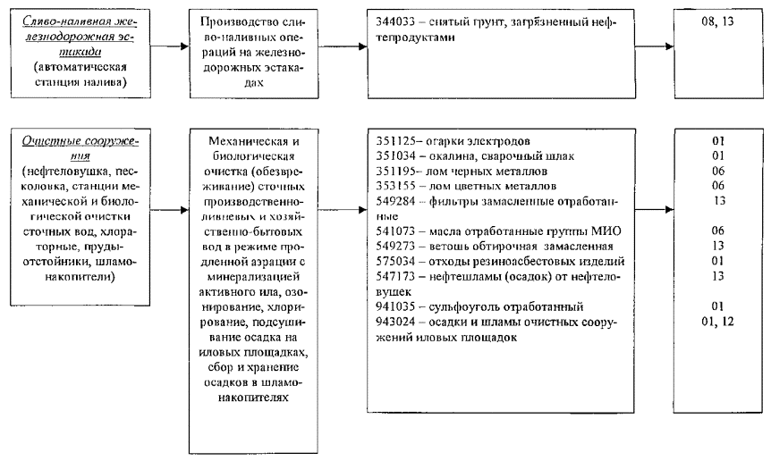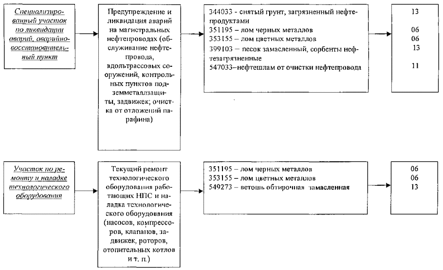 3.2. Инвентаризация источников образования отходов производства и потребления при эксплуатации, строительстве (реконструкции и техперевооружении) и капитальном ремонте производственных объектов магистральных нефтепроводовВ соответствии с «Методическими рекомендациями по оформлению проекта нормативов образования и лимитов размещения отходов» (Госкомэкологии, 1999) необходимо приводить характеристику производственных процессов предприятия как источника образования отходов. Источник образования отходов - это производственное подразделение, участок, оборудование, установка и другие объекты, на которых происходит тот или иной технологический процесс, сопровождающийся образованием отходов. Инвентаризация источников образования отходов проводится при обследовании предприятия с целью детализации контроля всех операций по обращению с отходами на каждом конкретном участке. Обобщенные результаты инвентаризации источников образования отходов в дочерних ОАО «АК «Транснефть» представлены ниже в сводных блок-схемах и таблице. Результаты инвентаризации приведены по основным структурным подразделениям дочерних ОАО, которыми являются районные нефтепроводные управления (РНУ), включающие промплощадки РНУ, нефтеперекачивающие станции (НПС), линейно-производственные диспетчерские станции (ЛПДС), районные диспетчерские пункты (РДП), базы производственного обслуживания (БПО), а также нефтебазы. Оформление результатов инвентаризации выполнено с учетом специфичности основного производства в ОАО «АК «Транснефть» (прием и перекачка нефти), а также в соответствии с «Методическими рекомендациями по оформлению проекта нормативов образования и лимитов размещения отходов» (Госкомэкология, 1999). БЛОК-СХЕМЫ ПРОИЗВОДСТВЕННЫХ ПРОЦЕССОВ, СОПРОВОЖДАЮЩИХСЯ ОБРАЗОВАНИЕМ ОТХОДОВ