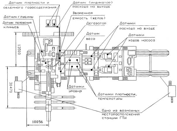 1.2 Типовое расположение станции ГТИ на буровой при кустовом бурении скважин показано на рис. 1.2.1, стр. 55. Здесь же показаны места установки датчиков обязательного комплекса исследований.