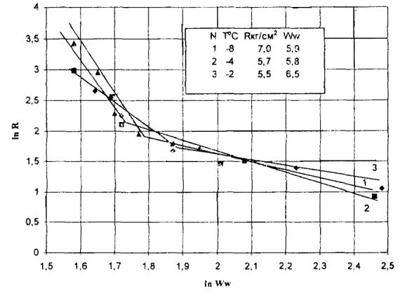 Рис. 3. Зависимость прочности R засоленного мерзлого мелкого песка от количества незамерзшей воды 5. КРИТЕРИИ ЗАСОЛЕННОСТИ И СОСТОЯНИЯ МЕРЗЛЫХ ГРУНТОВ5.1. Засоленность является важнейшим фактором, оказывающим влияние на прочность мерзлого грунта. Исследования по оценке влияния засоленности на прочность мерзлых песков, а также кривые зависимости прочности R от засоленности для пылеватых и мелких песков (рис. 4) показывают, что даже незначительное увеличение засоленности от 0,03 % до 0,1 % снижает их прочность примерно в 2 раза. При засоленности более 0,5 % и температурах до -6 °С мелкий песок практически находится в охлажденном состоянии и свойства его близки к свойствам талого песка. Для практических целей установлен пороговый критерий засоленности для пылеватых песков с морским типом засоления, равный 0,05 %, что можно считать приемлемым, так как такая величина поддается определению техническими средствами. На прочность мерзлых глинистых грунтов соль оказывает меньшее воздействие, поскольку при том же количестве воднорастворимых солей в таких грунтах исходная концентрация порового раствора меньше. Для засоленных глинистых грунтов также может быть установлен критерий засоленности, т.е. такой минимальный процент содержания солей, при котором прочность грунта начинает заметно отличаться от прочности идентичного незаселенного грунта. Так, для супеси критерий засоленности может быть принят равным 0,15 %, а для суглинков - 0,2 %, поскольку в пределах изменения засоленностей от 0 до 0,15 % прочность мерзлых глинистых грунтов снижается не более, чем на 10 - 20 %. 5.2. В зависимости от деформируемости мерзлые грунты характеризуются либо пластичномерзлым, либо твердомерзлым состоянием. При этом критерием границы перехода состояний является коэффициент сжимаемости грунта «а», который, согласно указаниям главы СНиП 2.02.04-88 равен 0,01 МПа-1 или 0,001 см2/кг. При меньшем значении коэффициента «а» грунт считается твердомерзлым, при большем - пластичномерзлым. С позиции проектировщика этот критерий состоит в том, что при твердомерзлом состоянии грунта расчет устойчивости оснований и фундаментов, ограничивается только расчетом по прочности мерзлого грунта, а при пластичномерзлом состоянии грунта устойчивость оснований следует рассчитывать по деформациям, развивающимся за период эксплуатации сооружения. На величину коэффициента сжимаемости влияют вид грунта, его влажность, температура и засоленность, предопределяющие фазовый состав и степень цементации грунта поровым льдом. Поэтому границу перехода твердомерзлого состояния грунта в пластичномерзлое состояние целесообразно связывать с фазовым составом влаги в грунте. Экспериментальные данные по содержанию незамерзшей воды Ww в рассматриваемых грунтах с различной засоленностью, а также данные по прочности R этих грунтов в зависимости от температуры позволили установить критерии перехода пластичномерзлого состояния грунтов в твердомерзлое. Для наглядности на рис. 4 показаны зависимости ln R - ln Ww для мелкого песка и легкого суглинка. Рекомендуемые критерии для грунтов с морским типом засоления приведены в табл. 1.