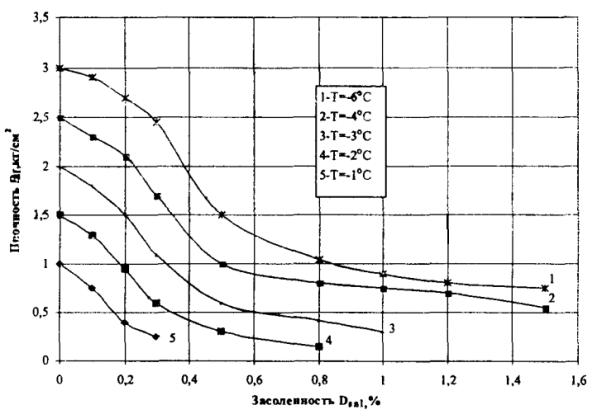 Рис. 4. Зависимость прочности (R) мерзлого мелкого и пылеватого песка от засоленности Рис. 5. Зависимость прочности смерзания (Raf) мерзлого тяжелого суглинка от засоленности 6. НОРМАТИВНЫЕ И РАСЧЕТНЫЕ ЗНАЧЕНИЯ ПРОЧНОСТНЫХ ХАРАКТЕРИСТИК ЗАСОЛЕННЫХ МЕРЗЛЫХ ГРУНТОВ6.1. Для составления таблиц нормативных значений прочности предпочтение отдавалось систематизированным материалам ПНИИИС и ЛенЗНИИЭП. При определении величин сопротивления нормальному давлению R к обработке были привлечено результаты около 250 испытаний пылеватых и мелких песков, около 220 опытов на супесях, более 300 опытов на легких и тяжелых суглинках и глинах по описанным выше требованиям. Сопротивление срезу засоленных мерзлых грунтов при смерзании с бетонными поверхностями Raf определялось на 2-х срезных и одноплоскостных сдвиговых приборах. Всего к обработке привлечено примерно по 150 - 170 опытов на сдвиг для каждой разновидности грунта. На рис. 5 приведены кривые зависимости прочности смерзания Raf от засоленности Dsal для тяжелого суглинка. 6.2. Для обработки фактических материалов, полученных другими исследователями, применен графоаналитический метод, заключающийся в построении семейства кривых значений прочности при различных отрицательных температурах (рис. 6). Если величины прочности при одной засоленности и температуре имели расхождение не более 10 %, они принимались как базовые для составления таблиц. 6.3. Нормативные и расчетные значения характеристик грунтов установлены на основе статистической обработки результатов экспериментальных определений в соответствии с ГОСТ 20522-96 и СНиП 2.02.01-83. При расчетах оснований используются расчетные значения характеристик грунта X, определяемые по формуле X = Хн / gg, где Хн - нормативное значение данной характеристики; gg - коэффициент надежности по грунту. Нормативное значение характеристики равно среднеарифметическому значению результатов испытаний, выполненных с заданной повторностью. Количество повторных определений искомой характеристики грунта, необходимое для вычисления нормативных и расчетных значений, согласно требованию СНиП 2.02.01-83 должно быть не менее шести. Однако, учитывая длительность и сложность испытаний мерзлых грунтов, ГОСТ 12248-96 допускает использовать не менее трех параллельных испытаний образцов исследуемого грунта. При подготовке данных для составления таблицы нормативных значений прочности было принято количество параллельных испытаний при определении R и Raf - равное трем и при определении R шариковым штампом - шести. Последние были подвергнуты