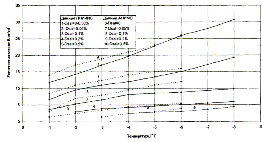 Расчетные давления R на мерзлые засоленные грунты (морской тип засоления) для глубины заложения фундамента 4 м
