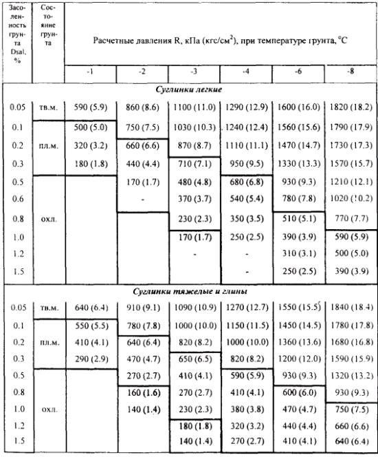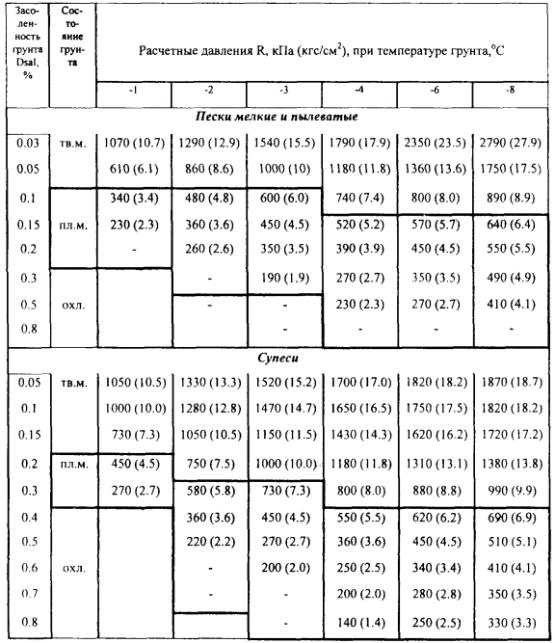 Обозначения: тв.м. - твёрдомёрзлое состояние грунта; пл.м. - пластичномёрзлое состояние грунта; охл. - охлаждённое состояние грунта. Продолжение таблицы 4 Расчетные давления R на мерзлые засоленные грунты (морской тип засоления) для глубины заложения фундамента 4 м