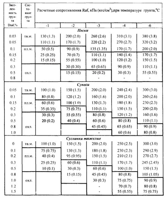 Расчетные сопротивления срезу по поверхности смерзания Raf мерзлых засоленных грунтов (морской тип засоления)