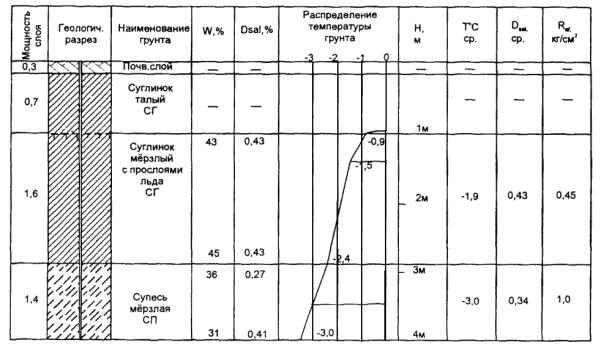 В данном примере мерзлый грунт однороден, Dsal постоянна по глубине, но температура Tz по глубине понижается. Соответственно возрастают и величины Raf. Поэтому общее сопротивление сдвигу следует определять методом послойного суммирования, разделив глубину зоны смерзания на n равных слоев при толщине каждого DZi, равной 2 м. Затем по температурам на границах каждого i-ого слоя определяются величины Rafi. Значения сопротивлений Raf находят по данным таблицы 6, интерполируя их по прогнозным температурам Tz на границах каждого из трех выделенных мерзлых слоев, а давление R, кроме того, скорректировано на величину разницы бытового давления DR = r[(Hт + Z) - 4]102 на глубинах (Hт + Z) и 4 м, поскольку данные по R в таблице 5 соответствуют глубине Hт + Z = 4 м (r - средняя плотность грунта вышележащих слоев в кг/см3). После подстановки данных в формулу 10 по условиям задачи находим: Fu = 1,0×[8,1×625 + (0,36×20000 + 0,52×20000 + 0,64×20000)] = 34500 (кгс) Если мерзлые грунты основания неоднородны по составу и засоленности Dsal, то задача осложняется необходимостью учета этих факторов при выборе границ слоев и расчетных значений Rafi. Например, необходима двойная интерполяция данных из табл. 5 по величинам Dsali и Ti для конкретных глубин Zi. Пример 2. Рассмотрим случай, в котором приведем расчет несущей способности сваи, аналогичной примеру 1, но установленной в более сложных инженерно-геологических условиях. Для наглядности исходные и расчетные данные размешаем в табл. 7. Здесь колонка 1 показывает мощность слоев, на которые условно разделен мерзлый массив основания в пределах глубины погружения сваи (границы слоев определяются сменой видов грунтов и их засоленностей. Колонка 2 - геологический разрез. Колонка 3 - границы слоев (по составу: СГ - суглинок, СП - супесь). Колонка 4 - распределение влажности W % по глубине. Колонка 5 - распределение засоленности Dsal по глубине. Колонка 6 - распределение прогнозных (расчетных) температур по глубине от подошвы сезонноталого слоя. Колонка 7 - глубина, м. Колонка 8 - средняя температура Т соответствующего слоя, определяемая по кривой распределения расчетных температур на глубине середины каждого слоя. Колонка 9 - средняя засоленность слоев. Колонка 10 - расчетные сопротивления сдвигу по поверхности смерзания Raf грунта данного слоя при его средней температуре Тi и засоленности Dsal. Величины R определяют по рекомендуемым в табл. 5 значениям с учетом вида грунта, его засоленности и температуры. Для промежуточных значений Dsal и Тi, данные табл. 7 по Raf интерполируют сначала по Dsal, а затем по Тi в пределах соответствующих интервалов табл. 5, вмещающих интересующие значения Dsal и Тi. По формуле 10 определяем расчетное сопротивление сил смерзания грунта со сваей для каждого выделенного слоя мерзлого грунта без торца: Fu = 1×3,14×32,5 (0 + 0,45×160 + 1,0×140) = 102×(72 + 140) =21600 кгс Аналогично находят допустимое расчетное давление под торцом сваи, по данным рекомендуемых в табл. 4 давлений R, но с учетом коррекции на бытовое давление грунта на глубине торца. Fо =pd2/4×R = (3,14×32,5/4)×4,5 = 3750 кгс Таким образом, несущая способность сваи, полученная послойным суммированием всех расчетных сопротивлений (сумма сил Fu = 25350 кгс). В данных примерах не учитывается влияние талых или охлажденных грунтов, перекрывающих мерзлые грунты основания, ввиду относительной малости их вклада и неопределенности момента их проявления. Кроме того