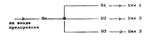 Отсюда, в частности, следует, что к точности и стабильности К4 жесткие требования можно не предъявлять, но аддитивная погрешность усилителя корректирующего сигнала, приведенная к его входу, должна быть весьма малой. Приложение 4Пример использования информационной избыточности для повышения точности измерений расхода газа, потребляемого предприятиемСхема измерений расхода газа на предприятии приведена на рис 3. Рис. 3 При измерениях расходов газа всеми потребителями на предприятии (расходы Q1, Q2, Q3) измерение общего расхода Qо может не производиться. Он определяется суммой Q1 + Q2 + Q3. Если расходомеры одинакового класса точности, то эта сумма расходов определяется более точно, чем результаты измерений расхода Qо на входе предприятия. При измерении расхода газа на входе предприятия общий расход газа, поступающего на предприятие, может быть также определен путем вычислений полусуммы 0,5 (Q1 + Q2 +Q3 + Qо). Этот результат получается более точным по сравнению с точностью намерений Qо на входе предприятия и суммой Q1 + Q2 + Q3. Для отыскания поправочных коэффициентов к показаниям расходомеров можно составить уравнения баланса. Предположим, что по данным измерений расходов в разные моменты времени или в результате усреднения расходов на определенных интервалах времени составлена система уравнений вида: