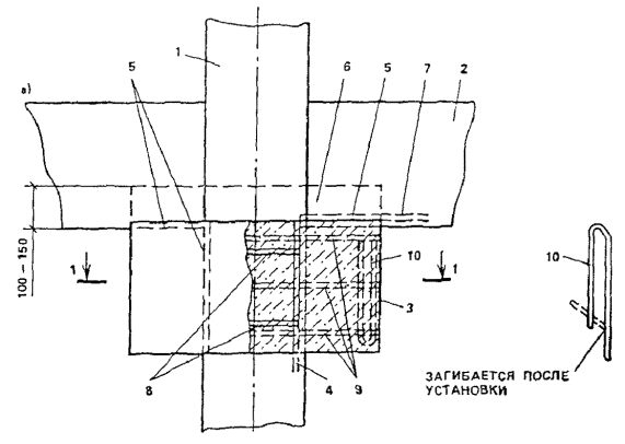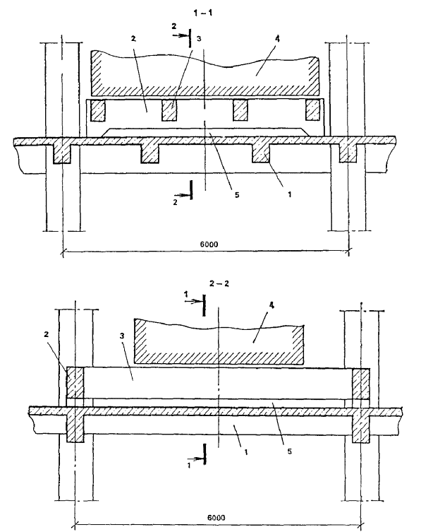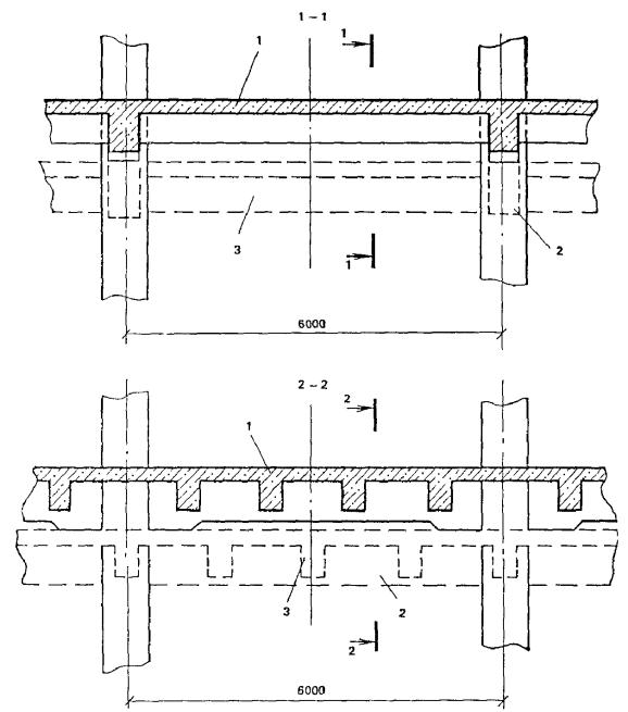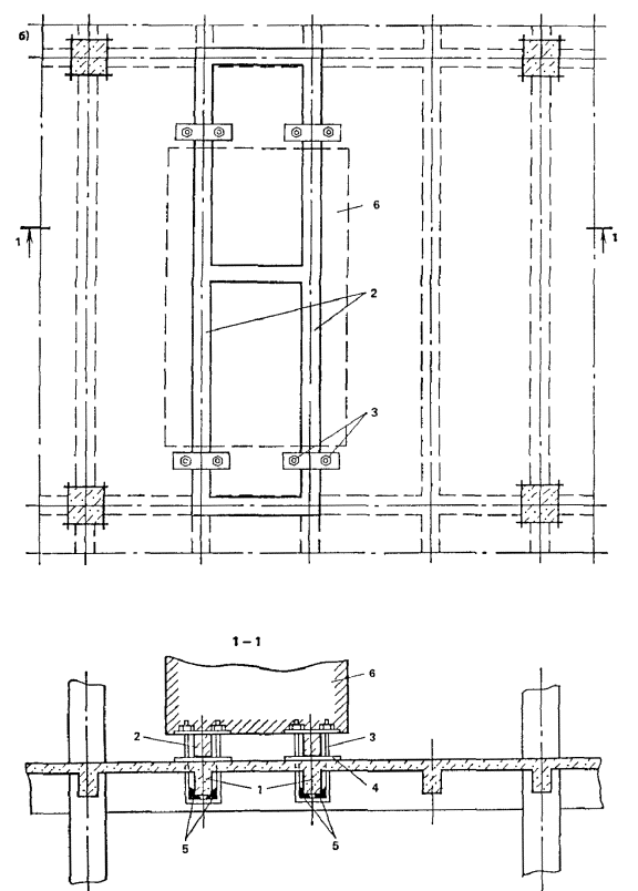 Рис. 4. Полное разгружение плиты монолитного перекрытия ребристыми плитами 1 - разгружаемая плита; 2 - разгружающая конструкция; 3 - элементы крепления; 4 - ригель; 5 - прокладки из уголков Фиксирующие элементы для горизонтальной плоскости пропускаются через отверстия в перекрытии так, чтобы нагрузка от них передавалась на разгружаемые конструкции. При полном разгружении элементов конструкций необходимо обязательно предусматривать зазор между разгружающими и разгружаемыми элементами для обеспечения свободного прогиба разгружающего элемента согласно п. 3.17 настоящих Рекомендаций (см. рис. 1). 2.4. Если в результате установки разгружающих элементов сверху перекрытий создаются различный уровень пола или стесненные габариты производственных помещений, возможна установке или подвеска элементов снизу перекрытий (см. рис. 6). Нагрузку на конструкции разгружения в этих случаях передают с помощью стоек, пропущенных через отверстия, пробитые в существующем перекрытии. Разгружающие конструкции, устанавливаемые снизу перекрытий на существующие колонны или подвешиваемые к главным балкам, рекомендуется проектировать металлическими. При использовании конструкций полного разгружения следует учитывать изменение расчетной схемы. Рис. 5. Возведение нового перекрытия с последующей разборкой существующего и сохранением опорного участка 1 - конструкции нового перекрытия; 2 - главная балка существующего перекрытия; 3 - второстепенная балка существующего перекрытия 2.5. Замена существующих конструкций новыми (см. рис. 5), воспринимающими на себя всю полезную нагрузку, рекомендуется лишь в тех случаях, когда существующая конструкция препятствует необходимому увеличению габаритов помещения по требованиям новой технологии или когда она находится в состоянии, при котором возможно ее полное или частичное обрушение в незагруженном состоянии. 2.6. Дополнительные разгружающие элементы при частичном разгружении могут иметь контакт с существующими конструкциями по всей длине или в отдельных точках. Рассматривать дополнительные разгружающие элементы как конструкцию частичного разгружения, в отличие от наращивания (см. пп. 3.22 - 3.25), следует в случае, если при их устройстве не обеспечивается по всей длине совместная работа с усиливаемым элементом. Частичное разгружение элементов конструкций (плит перекрытий, второстепенных балок, главных балок, ригелей, подкрановых балок и т.п.) рекомендуется применять в тех случаях, когда с разгружаемой конструкции необходимо снять только часть полезной нагрузки. Конструкции частичного разгружения могут быть как железобетонными, так и металлическими (рис. 7 - 8), при этом необходимо иметь в виду, что частичное разгружение, по существу, является и усилением существующей конструкции, т.е. увеличением ее несущей способности. 2.7. В случаях, когда опорные сечения элементов, на которые передают нагрузку разгружающие конструкции, не обладают необходимой несущей способностью, а также в случаях, когда отсутствуют опоры для установки разгружающих конструкций, на колоннах следует устраивать специальные опорные хомуты (рис. 9). Опорные хомуты могут быть как железобетонными, так и металлическими с последующим обетонированием или без него. 2.8. Перед устройством железобетонных опорных хомутов бетонные поверхности колонн и ри