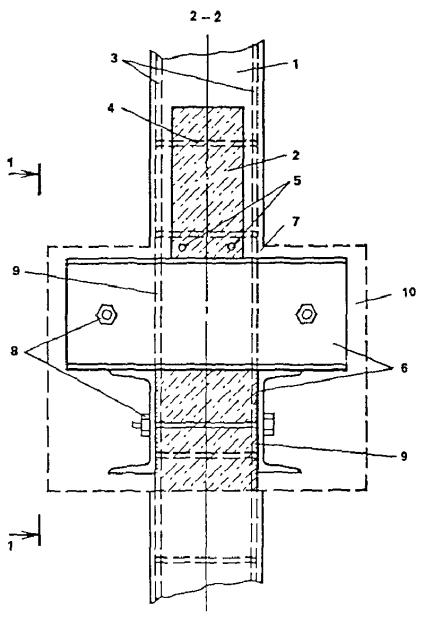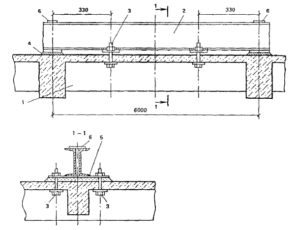 Рис. 2. Полное разгружение железобетонной балки металлическими обоймами 1 - разгружаемая балка; 2 - металлическая разгружающая балка; 3 - фиксирующие болты; 4 - опорные подушки; 5 - сварные швы; 6 - соединительные накладки