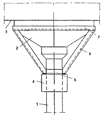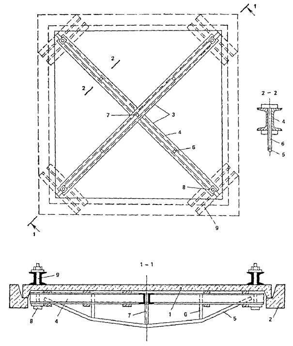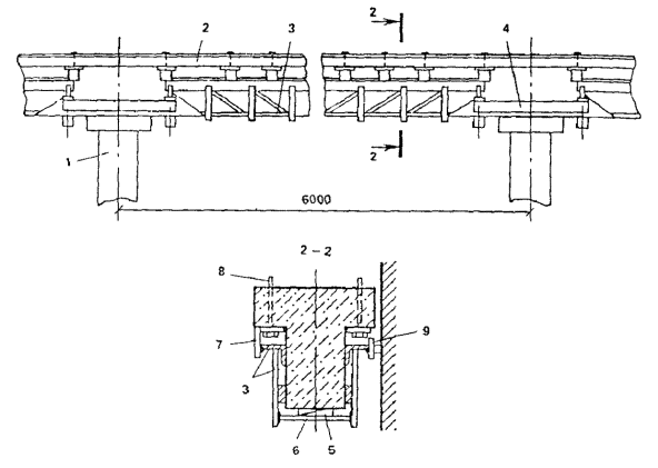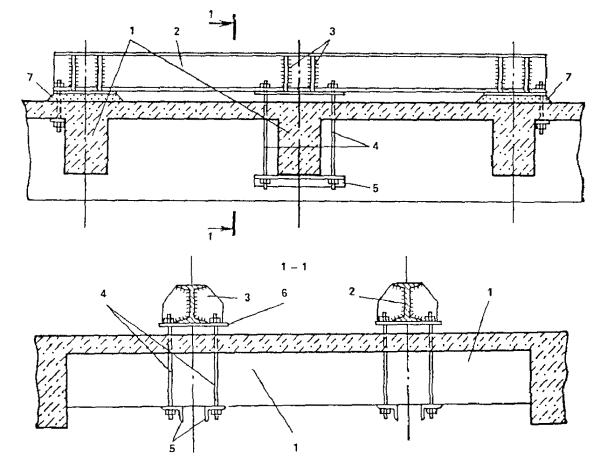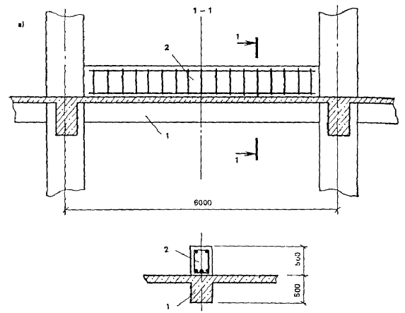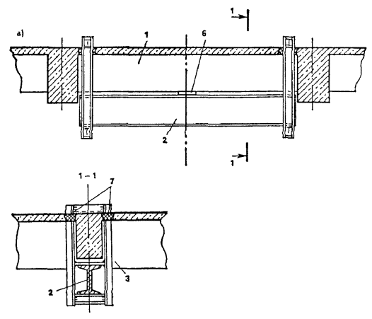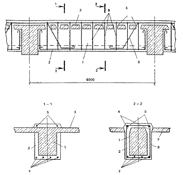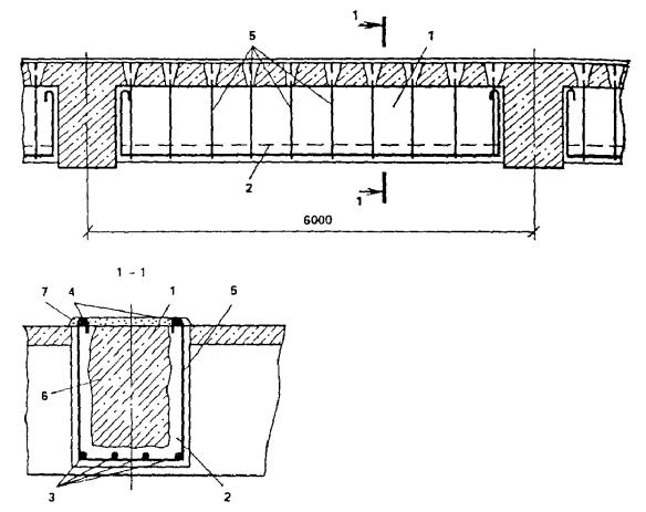 Рис. 3. Полное разгружение второстепенной балки и плиты перекрытия металлическими балками 1 - разгружаемая балка; 2 - металлические балки разгружения; 3 - ребра жесткости; 4 - тяжи; 5 - планки из уголков; 6 - опорные листы; 7 - опорные подушки