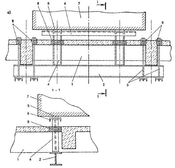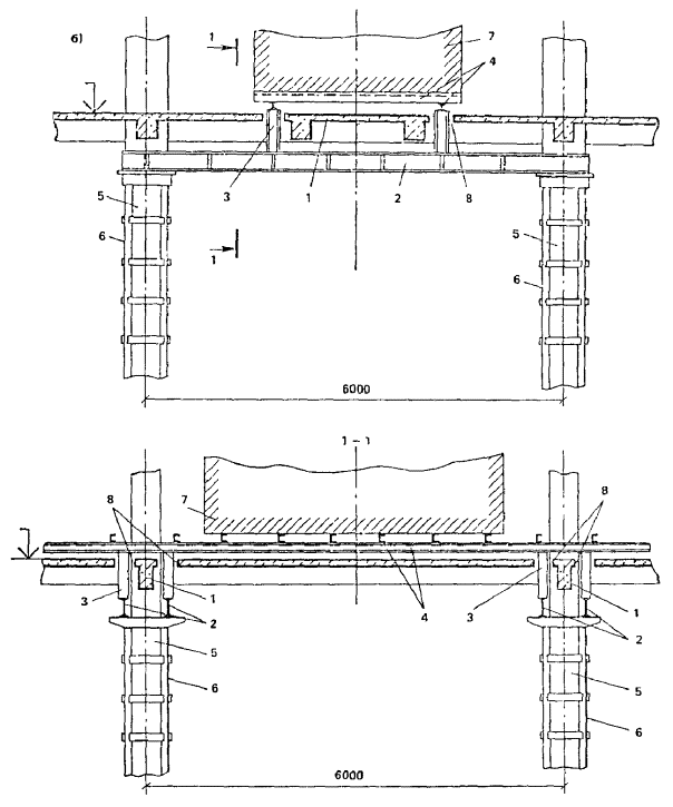 Рис. 6. Полное разгружение участка перекрытия а - металлическими балками, подвешенными снизу к главным балкам: 1 - разгружаемый участок перекрытия; 2 - металлические балки разгружения; 3 - тяжи; 4 - стойки; 5 - прокладки; 6 - опорные швеллеры; 7 - оборудование; 8 - отверстия в плите, заделываемые асфальтом; б - металлическими балками, опирающимися на обоймы колонн: 1 - разгружаемый участок перекрытия; 2 - главная разгружающая балка; 3 - стойки; 4 - разгрузочные балки; 5 - колонны; 6 - металлические обоймы; 7 - оборудование; 8 - зазоры 2.10. В случаях, когда опорные хомуты предназначены для опирания на них вновь возводимых элементов, их конструктивные особенности сохраняются (см. рис. 9, б), но отпадают меры для заполнения пространства бетоном под ригелем при железобетонных опорных хомутах и подгонки швеллеров к арматуре ригелей - при металлических. 2.11. Одним из распространенных способов усиления стержневых элементов являются обоймы, характерной особенностью которых является охват усиливаемого элемента со всех четырех сторон (рис. 10 - 13). Обоймы могут быть железобетонными и металлическими. 2.12. Усиление изгибаемых элементов (ригелей, балок и т.п.) обоймами рекомендуется только в тех случаях, когда по каким-либо причинам (например, значительная коррозия арматуры) нельзя применить способ одностороннего наращивания, поскольку усиление изгибаемых элементов по всему периметру сечения помимо трудностей, связанных с производством работ, нерационально с конструктивной точки зрения. 2.13. Минимальная толщина железобетонных обойм изгибаемых элементов принимается в зависимости от защитного слоя в соответствии со СНиП 2.03.01-84* и диаметра арматуры (продольной и поперечной); максимальная - обычно не превышает 100 мм. Площадь продольной арматуры определяется расчетом.