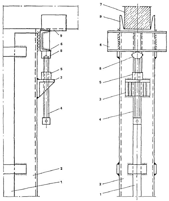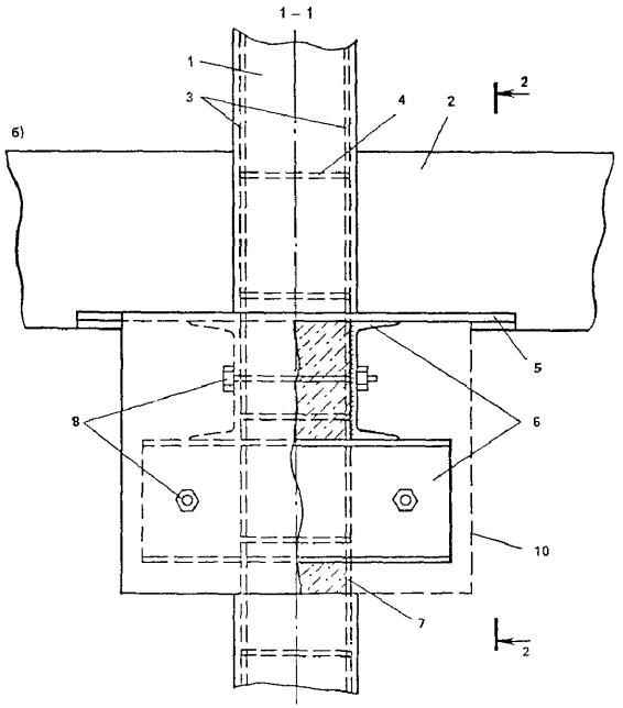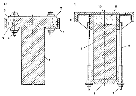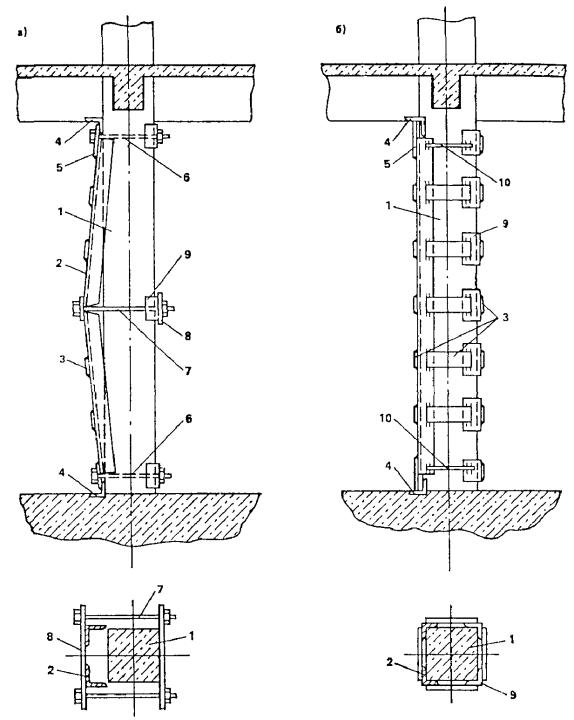 Рис. 9. Конструкция опорного хомута а - из железобетона: 1 - колонна; 2 - ригель; 3 - опорный хомут; 4 - арматура колонны; 5 - сколотая поверхность; 6 - участок, бетонируемый под давлением; 7 - арматура ригеля; 8 - хомуты; 9 - арматура опорного хомута; 10 - шпильки; б - из профильного металла с обетонкой: 1 - колонна; 2 - ригель; 3 - арматура колонны; 4 - хомуты; 5 - арматура ригеля; 6 - швеллеры опорного хомута; 7 - сколотая поверхность; 8 - стяжные болты; 9 - сварные швы; 10 - обетонка Рис. 10. Усиление монолитной балки железобетонной обоймой 1 - усиливаемая балка; 2 - обойма; 3 - плита; 4 - отверстия в плите для пропуска хомутов и подачи бетона; 5 - монтажная арматура обоймы; 6 - наклонные стержни обоймы; 7 - рабочая арматура обоймы; 8 - хомуты обоймы При устройстве металлических обойм обязательными условиями являются плотное примыкание металлических стоек к граням усиливаемой колонны и их вертикальность. Для достижения этих условий рекомендуется поверхность бетона в месте примыкания стоек выравнивать сколом неровностей и зачеканкой цементным раствором. Эффективность усиления зависит от примыкания по торцам металлических стоек. Включение металлических обойм в совместную работу может осуществляться с помощью специальных приспособлений. Один из вариантов подобного приспособления показан на рис. 13. Рис. 11. Усиление колонии железобетонной обоймой а - со стержневой арматурой; б - с жесткой наружной арматурой из уголков; 1 - усиливаемая колонна; 2 - обойма; 3 - продольная арматура обоймы; 4 - поперечная арматура обоймы; 5 - жесткая продольная арматура обоймы; 6 - опорные уголки жесткой обоймы 2.20. Эффективность усиления металлической обоймой значительно возрастает, если пояса вокруг колонны, образованные соединительными планками, выполнить предварительно напряженными. Ввод в напряженное состояние металлических поясов рекомендуется осуществлять следующим образом: соединительные планки каждого из поясов устанавливают на одном уровне и приваривают одной стороной к стойкам; затем приступают к замыканию среднего по высоте колонны пояса, для чего нагревают соединительные планки двух противоположных граней до температуры 100 °С и приваривают к стойкам в нагретом состоянии. Аналогично поступают с планками смежных граней. Таким же образом замыкают остальные пояса обоймы. По мере остывания нагретых соединительных планок усиливаемая колонна подвергается обжатию металлическими поясами. Рис. 12. Усиление колонны а - железобетонной обоймой со спиральной арматурой: 1 - усиливаемая колонна; 2 - обойма; 3 - спиральная арматура; б - металлической обоймой: 1 - усиливаемая колонна; 2 - стойки-уголки; 3 - соединительные планки; 4 - подкладки; 5 - зачеканка цементным раствором 2.21. Конструктивное решение, известное как рубашка, представляет собой незамкнутую с одной стороны обетонку (рис. 14 - 16). Рубашки рекомендуется применять в тех же случаях, что и обоймы, когда по каким-либо причинам не имеется возможности охватить усиливаемый элемент со всех четырех сторон, например колонна, примыкающая одной стороной к стене (см. рис. 15). Рис. 13. Приспособление для включения в работу металлической обоймы колонны (а. с. № 607932. - БИ, 1977, № 19) 1 - усиливаемая колонна; 2 - обойма; 3 - столик; 4 - металлический винт; 5 - гайка; 6 - упорный элемент; 7 - ригель; 8 - динамометр; 9 - прокладка Рубашки чаще применяются при усилении монолитных бало