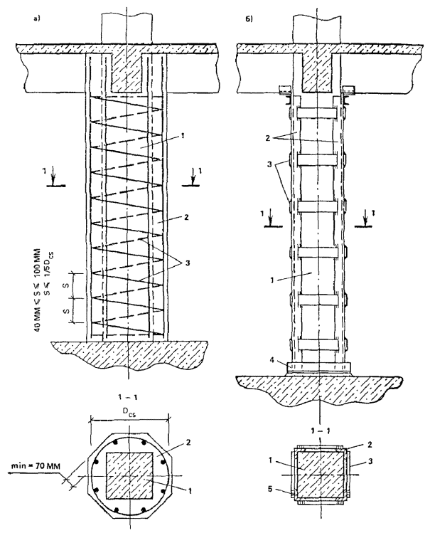 Примечания: 1. Знак «+» обозначает, что данный способ усиления рассматриваемой конструкции отвечает соответствующим характеристикам; знаком «0» обозначено, что данный способ может отвечать или не отвечать указанным характеристикам в зависимости от местных условий и конкретного конструктивного решения; знаком «-» обозначено, что способ не соответствует указанным характеристикам. 2. Несоответствие способа характеристике гр. 6 относится к случаю применения сварки металлических элементов. 3. Усиление колонн металлическими обоймами без скола углов и установки на растворе не обеспечивает совместную работу усиливаемой и усиливающей конструкции; усиление ригелей и балок разгружающими конструкциями, ферм - металлическими обоймами, плит перекрытий и покрытий - предварительно напряженными затяжками не требует совместной работы. 4.36. В качестве основных критериев оценки и выбора из числа приемлемых вариантов усиления по пп. 4.32 - 4.35, в зависимости от общих требований проекта реконструкции могут быть приняты различные факторы в порядке предпочтительности. Если проект реконструкции исключает остановку производства, основными при выборе способа усиления являются факторы группы «в» (усиление без остановки производства), которым соответствуют графы 3, 5 табл. 6. Другими факторами могут быть: значительное увеличение несущей способности, отсутствие уменьшения габаритов помещений в результате усиления или другие факторы групп «г» и «д» (гр. 6 - 17 табл. 6). Если проектом по каким-либо причинам предусмотрена реконструкция с остановкой производства, основными при выборе способов усиления являются факторы, обусловливающие минимальную его продолжительность. К ним относятся факторы группы «д» (гр. 7 - 10 табл. 6) и зависящая от них трудоемкость (и, следовательно, продолжительность) выполнения работ по усилению. При этом трудоемкость и продолжительность усиления каждым из принятых для оценки и выбора способов усиления определяется на основе экономического анализа, методика выполнения которого приведена в пп. 4.53 - 4.64. 4.37. При выборе способов усиления необходимо также руководствоваться рекомендациями, приведенными в пп. 4.38 - 4.46. 4.38. При усилении обетонированием (обоймы, рубашки, наращивание сечения) и дополнительной ненапрягаемой арматурой следует стремиться к максимальному разгружению усиливаемой конструкции. Для усиления железобетонных конструкций под нагрузкой в основном рекомендуется применение металлических предварительно напряженных элементов. Например, для колонн целесообразно применять предварительно напряженные распорки, а для балок - предварительно напряженные затяжки. 4.39. Бетонные поверхности конструкций, усиливаемых металлическими обоймами или предварительно напряженными распорками, не должны иметь местных выступов и неровностей, превышающих: при установке элементов усиления с последующей зачеканкой швов - 5 мм; при установке на растворе - 10 мм. При более значительных неровностях рекомендуется применять железобетонные обоймы. 4.40. При выборе способа усиления колонн рекомендуется учитывать характер их разрушения при различных значениях эксцентриситетов: больших - от достижения арматурой предельного расчетного сопротивления (предела текучести) с одновременным разрушением сжатой зоны бетона (как в изгибаемых элементах