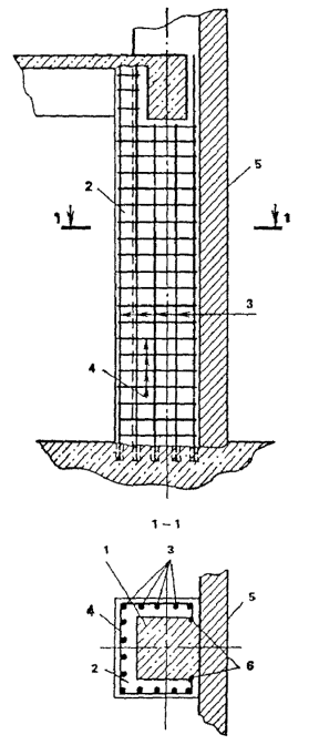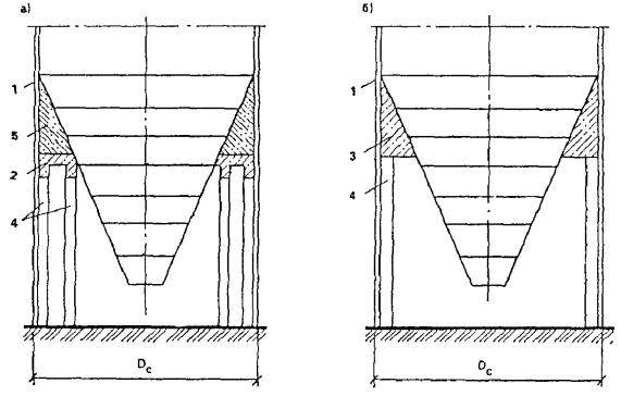 Рис. 54. Усиление стен хранилищ а - стальными бандажами с заданным зазором: 1 - усиливаемая стена; 2 - бандаж; 3 - стяжной болт; 4 - упоры стяжного болта; 5 - сварка бандажа после обжатия; б - предварительно напряженной обоймой: 1 - усиливаемая стена; 2 - предварительно напряженная обойма; 3 - прокатные профили; 4 - напрягаемая арматура 2.114. Усиление устройством внутренних перегородок применяют, как правило, в емкостных сооружениях прямоугольного в плане сечения. При этом усиление достигается за счет уменьшения пролета стен, к которым примыкает перегородка, а также за счет снижения горизонтальных нагрузок от сыпучего материала в емкостях силосного типа. 2.115. При усилении стен прямоугольных в плане хранилищ рекомендуется устройство внутри емкости горизонтальных железобетонных тяжей или плоских диафрагм на части высоты емкости. Диафрагмы, как правило, не доходят до днища хранилища, поэтому не препятствуют свободной разгрузке сыпучего материала из всех отсеков емкости. 2.116. При определении нагрузок на перегородки, тяжи и диафрагмы необходимо учитывать сдвигающие усилия за счет трения сыпучего материала и на эти усилия выполнять расчет сопряжения элементов по контактной поверхности. Расчеты с учетом сил трения необходимо выполнять независимо от категории хранилищ (силосного или бункерного типа). 2.117. При усилении с устройством сопряжения перегородок, тяжей и диафрагм втавр к существующим стенам рекомендуется предусматривать нормальное к поверхности сопряжения армирование на нагрузку N = 1,4 - 1,7 Qк, где Qк - сдвигающее усилие по контактной поверхности. Рекомендуется также предусматривать обжатие по поверхности контакта нормальными усилиями N = 0,3 - 0,4 Qк, которое должно выполняться после набора новым бетоном 80 %-ной проектной прочности. 2.118. Одним из способов усиления разрушенных стен цилиндрических хранилищ является устройство внутренних подвесных стальных экранов. Экраны выполняют из листового металла замкнутыми в кольцевом направлении и подвешивают к стенам в верхней части таким образом, чтобы между существующей стеной и экраном был обеспечен зазор 100...150 мм. Существующие железобетонные стены хранилищ работают только на вертикальные нагрузки, а горизонтальные усилия воспринимаются стальным подвесным экраном. Для случая горячих сыпучих материалов зазор между экраном и стеной может служить теплоизолятором и выполняться проветриваемым. 2.119. В случае, если несущая способность стен недостаточна дли восприятия вертикальных нагрузок от подвесного экрана, монтаж последнего выполняют непосредственно на вертикальные стойки жесткого металлического каркаса внутри емкости. Устойчивость конструкции экрана обеспечивается самим каркасом. 2.120. Усиление стен емкостей для сыпучих материалов при вынужденном устройстве внецентренного выпуска рекомендуется выполнять двумя группами способов - без изменения статической схемы и напряженного состояния и косвенным усилением путем снижения нагрузки. При силовом усилении наиболее рационально по высоте на участках с максимальным горизонтальным давлением предусматривать устройство поясов, бандажей, стальных или железобетонных гильз. 2.121. Косвенное усиление стен хранилищ при внецентренной выгрузке сыпучего материала выполняют изменением конструктивного решения емкости путем расположения н