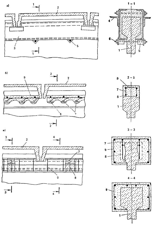 Рис. 7. Частичное разгружение второстепенной балки а - монолитной железобетонной балкой: 1 - разгружаемая конструкция; 2 - разгружающая конструкция; б - сборными железобетонными балками: 1 - разгружаемые конструкции; 2 - разгружающие конструкции; 3 - фиксирующие хомуты; 4 - листовые подкладки; 5 - подкладки из уголков; 6 - оборудование; в - металлическими балками из швеллеров: 1 - разгружаемая балка; 2 - разгружающая балка; 3 - подвеска; 4 - прокладка Рис. 8. Частичное разгружение подкрановой балки дополнительными решетчатыми конструкциями 1 - колонна; 2 - подкрановая балка; 3 - разгружающая ферма; 4 - упорная обойма; 5 - клиновидные прокладки; 6 - планки-связи; 7 - упорные пластины; 8 - болты; 9 - односторонняя связь 2.14. В случаях, когда изгибаемый элемент входит в состав монолитного ребристого перекрытия, при усилении его обоймой в плите перекрытия необходимо просверливать отверстия для пропуска хомутов и подачи бетонной смеси при бетонировании. При усилении перекрытия в целом выполнение обойм для балок и набетонка плиты сверху производятся одновременно. 2.15. Наиболее широкое применение обойм рекомендуется для усиления колонн. В этом случае достигается наибольшая эффективность этого конструктивного решения. Для усиления колонн применяется несколько типов обойм, которые различаются конструктивными особенностями, материалами, производством работ и эффективностью усиления. 2.16. Одним из типов железобетонных обойм являются обоймы с обычной продольной и поперечной арматурой (см. рис. 11) без связи арматуры обоймы с арматурой усиливаемой колонны. Перед бетонированием обоймы необходимо обязательно произвести подготовку поверхности усиливаемой конструкции (выполнить насечку бетона и промыть его струей воды). Толщина обоймы колонны зависит от степени усиления и обычно не превышает 300 мм. Минимальная толщина обойм, по требованиям технологии усиления, приведена в п. 4.4. Площадь продольной арматуры обоймы определяется расчетом, но ее диаметр должен быть не менее 16 мм для сжатых и 12 мм для растянутых стержней. Поперечная вязаная арматура принимается диаметром не менее 6 мм, а сварная - 8 мм и устанавливается с шагом 15 диаметров продольной, но не более трехкратной толщины обоймы и не более 200 мм. В местах возможной концентрации напряжений шаг хомутов должен быть уменьшен вдвое. Конструирование арматуры должно выполняться в соответствии с требованиями СНиП 2.03.01-84*. При устройстве местной обоймы на поврежденном участке она должна выходить за его пределы на длину не менее 5 толщин обоймы, не менее длины анкеровки арматуры, не менее двойной ширины большей грани колонны и не менее 400 мм. Для улучшения сцепления нового бетона со старым рекомендуется на поверхности старого бетона на участке местной обоймы выполнять адгезионную обмазку из полимерных материалов. 2.17. Разновидностью железобетонных обойм колонн являются обоймы с устанавливаемой вдоль их граней жесткой наружной арматурой из уголков, которая у концов усиливаемых колонн приваривается к горизонтальным опорным уголкам (см. рис. 11). Рекомендуются для конструкций с малыми эксцентриситетами приложения нормальных сил. 2.18. Железобетонные обоймы колонн могут быть выполнены с поперечной арматурой в виде спиральной обмотки из проволочной арматуры диаметром не менее 6 мм (см. рис. 12, а). При конструировании обойм