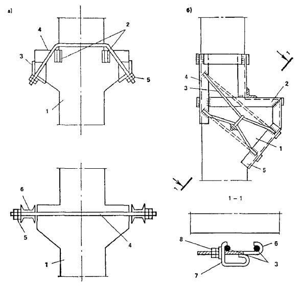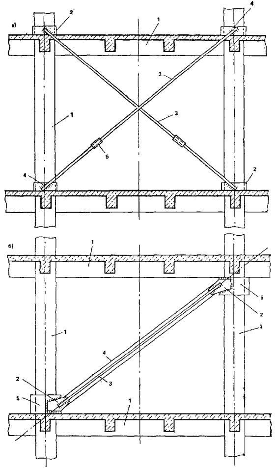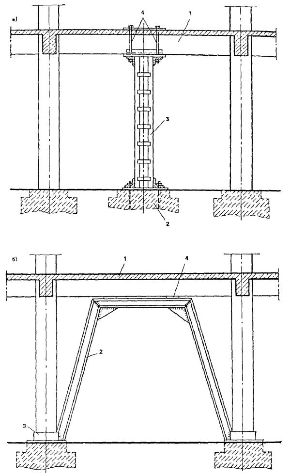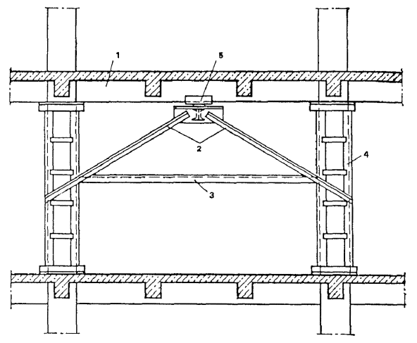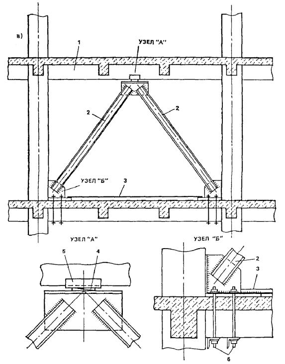 Рис. 20. Усиление дополнительной жесткой опорой а - подведенной металлической стойкой: 1 - усиливаемая конструкция; 2 - отдельный фундамент под дополнительную опору; 3 - металлическая стойка; 4 - элементы крепления; б - подведенным металлическим порталом: 1 - усиливаемая конструкция; 2 - подведенный металлический портал; 3 - охватывающий металлический хомут; 4 - прокладки; в - металлическими подкосами: 1 - усиливаемый ригель; 2 - металлические подкосы; 3 - затяжка на уровне пола; 4 - клиновидные прокладки; 5 - опорный уголок; 6 - фиксирующие болты Рис. 21. Усиление ригеля металлическими подкосами с опорой на обойму колонны 1 - усиливаемый ригель; 2 - металлические подкосы; 3 - затяжка; 4 - металлическая обойма колонны; 5 - прокладки 2.35. Для уменьшения изгибающих моментов в элементах многопролетной многоярусной рамы от воздействия ветровой нагрузки могут быть рекомендованы крестовые предварительно напряженные связи из гибких металлических тяжей (рис. 26). Напряжение таких связей проще всего осуществить при помощи стяжных муфт, однако не исключается и применение термического способа. Для анкеровки необходимо предварительно устраивать специальные анкерные хомуты из листового металла, закрепляемые на колоннах. Необходимо иметь в виду, что связи разрешается устанавливать по высоте одной и той же рамы в разных пролетах, что позволяет использовать те пролеты, где это удобнее, исходя из условий технологического процесса. 2.36. Для целей, указанных в п. 2.35, можно рекомендовать также усиление железобетонными раскосами с предварительно напряженными затяжками (см. рис. 26). После установки раскоса в проектное положение гибкие металлические тяжи напрягаются термическим способом с обеих сторон раскоса. Элемент усиления в целом может воспринимать как сжимающие, так и растягивающие усилия. 2.37. Для усиления в основном сборных балок покрытия больших пролетов и ферм под нагрузкой могут быть рекомендованы предварительно напряженные шарнирно-стержневые цепи. Применение шарнирно-стержневых цепей позволяет создать противоположную по знаку нагрузку в виде ряда сосредоточенных грузов, расположение и величины которых намечаются заранее в зависимости от очертаний цепей. Эффект усиления (создание реактивных сил заданных величин) достигается натяжением статически определимой цепи. Основными элементами при усилении этим способом являются: собственно шарнирно-стержневая цепь, состоящая из двух одинаковых ветвей по обе стороны усиливаемой балки (уголки с подрезанными вертикальными полками в местах перегиба, арматурные стержни до 30...36 мм диаметром или канаты); анкерные устройства в виде сварных накладок из листового металла в верхней зоне балок над опорами; подвески, обычно из круглой стали, или стойки из профильного металла в местах перегиба ветвей цепи (рис. 27, 28). Арматурные стержни принимаются из стали классов A-I, A-II, A-III, металлические конструкции - из сталей ВСт3сп, ВСт3пс, ВСт3кп. Сварные соединения необходимо выполнять с особой тщательностью. 2.38. Все элементы цепи рекомендуется изготавливать заранее в соответствии с размерами усиливаемой балки, тщательно проверенными в натурных условиях. Элементы цепи следует устанавливать в определенной последовательности. К закрепленным на балке анкерным устройствам подвешивают обе ветви цепи с заранее прикрепленными под