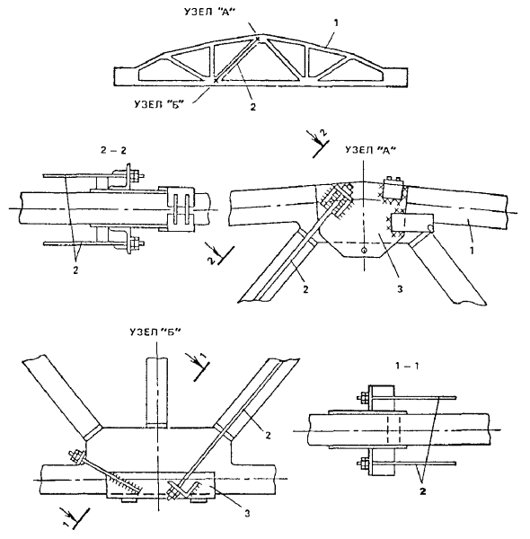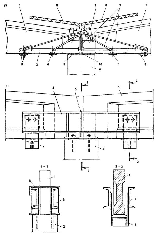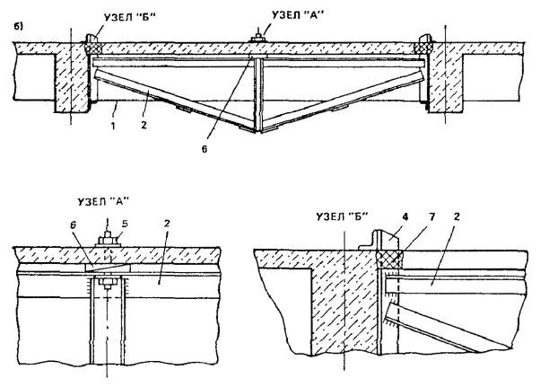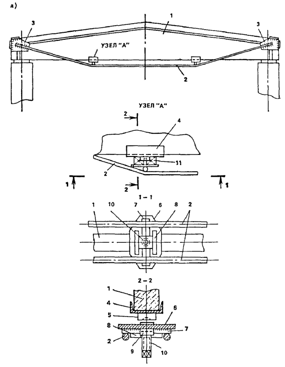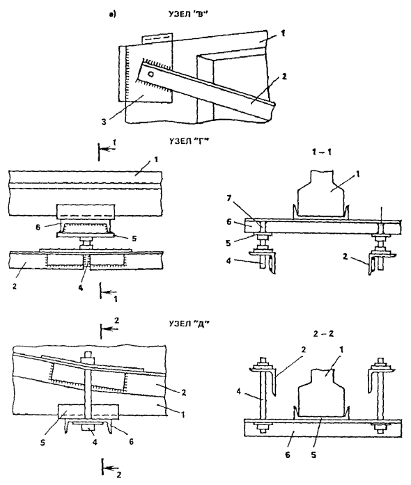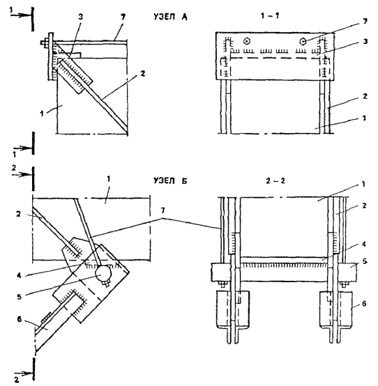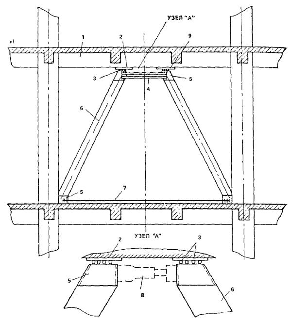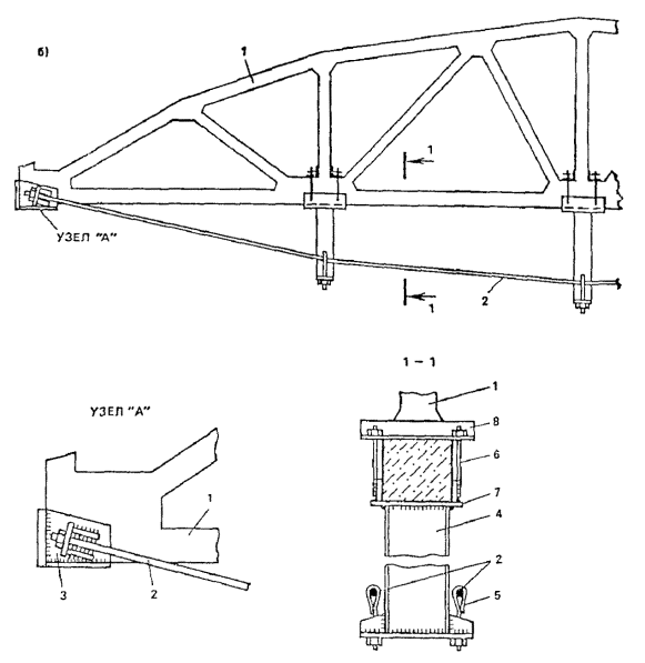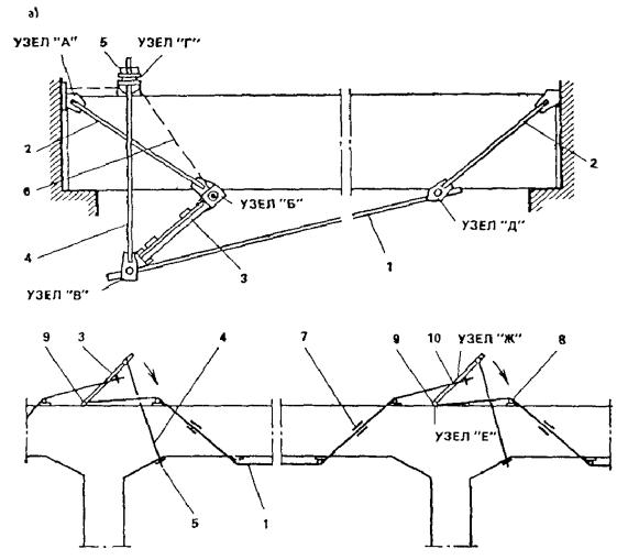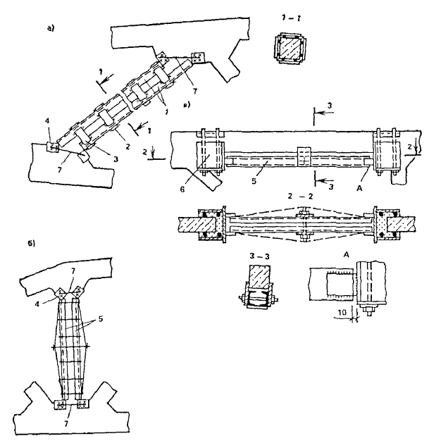 Рис. 31. Усиление балки дополнительной предварительно напряженной арматурой а - горизонтальными затяжками: 1 - усиливаемая балка; 2 - горизонтальные затяжки; 3 - уголок анкера; 4 - вертикальные стержни анкера; 5 - натяжной болт; 6 - шайба; 7 - отверстие, заделываемое после установки анкера; б - промежуточными распорками: 1 - усиливаемая балка; 2 - затяжки; 3 - промежуточные распорки; 4 - натяжной болт; 5 - анкерное устройство; в - шпренгельными затяжками: 1 - усиливаемая балка; 2 - шпренгельные затяжки; 3 - подкладка; 4 - коротыш; 5 - натяжной болт; 6 - шайба; 7 - швеллер анкера; 8 - отверстие, заделываемое после установки анкера; г - комбинированными затяжками: 1 - усиливаемая балка; 2 - горизонтальные затяжки; 3 - шпренгельные затяжки; 4 - подкладка; 5 - коротыши; 6 - уголок анкера горизонтальных затяжек; 7 - вертикальные анкерные стержни; 8 - натяжной болт; 9 - шайба; 10 - швеллер анкера шпренгельных затяжек; 11 - отверстие, заделываемое после установки анкера 2.49. В отдельную группу усиления дополнительной арматурой могут быть объединены и рекомендованы к применению затяжки, напрягаемые посредством взаимного стягивания двух или четырех стержней специальными стяжными болтами (см. рис. 31). Стяжные болты должны иметь вид хомута с двумя нарезными концами и общей шайбой. Натяжение производится одновременным подтягиванием гаек на обоих концах этого хомута. Натяжение посредством взаимного стягивания характеризуется простотой и не требует значительных усилий, поскольку напряжения в стяжных болтах (хомутах) в 7...10 раз меньше напряжений в стягиваемых дополнительных стержнях. Данный способ позволяет создать во всех стягиваемых стержнях (двух или четырех) равномерные усилия, т.е. обеспечивает их саморегулирование. Стягивание может производиться одним стяжным болтом или двумя, с промежуточными распорками или без них. Вертикальные стержни анкеров-затяжек пропускаются через просверленные в перекрытии отверстия для анкеровки. Рис. 32. Специальные усиливающие устройства для изгибаемых элементов а - устройство шпренгельного типа; б - многопролетное рычажное устройство; 1 - затяжка; 2 - наклонная ветвь опоры усиления; 3 - рычаг; 4 - вертикальная тяга; 5 - натяжное приспособление; 6 - монтажная связь; 7 - стык стержней затяжки; 8 - опорная прокладка; 9 - шарнирное сочленение рычага с затяжкой; 10 - анкеровка затяжки на рычаге 2.50. При необходимости создания больших усилий натяжения в затяжках для усиления однопролетных балок рекомендуется усиливающее устройство шпренгельного типа (см. рис. 32). Рис. 33. Усиливающее устройство шпренгельного типа узлы A, Б: 1 - усиливаемая балка; 2 - накладная ветвь опоры усиления; 3 - опорный уголок; 4 - опорная подкладка; 5 - цилиндрический шарнир; 6 - рычаг; 7 - монтажная связь;