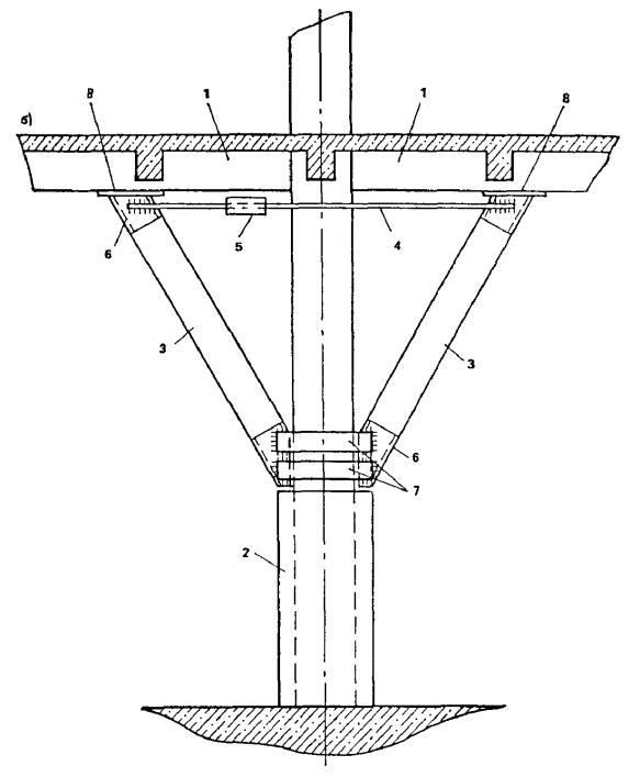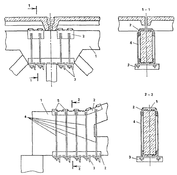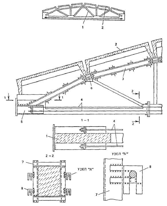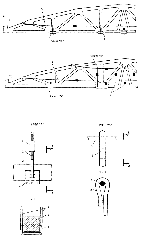 Рис. 40. Усиление железобетонных ферм шарнирно-стержневыми цепями а - с расположением ветвей в пределах высоты ферм: I - одноярусной цепью; II - двухъярусной цепью; 1 - шарнирно-стержневая цепь; 2 - натяжные подвески; 3 - нижний пояс фермы; 4 - стяжная муфта; 5 - опорная подкладка; б - расположенными ниже пояса фермы: 1 - усиливаемая ферма; 2 - шарнирно-стержневая цепь; 3 - анкерное устройство; 4 - стойка; 5 - тяжи; 6 - подвески; 7 - опорная подкладка; 8 - уголки подвески 2.86. Обоймы устанавливаются по всей длине усиливаемого элемента. Включение в работу обойм обеспечивается за счет распора, возникающего в ветвях при деформации усиливаемого элемента от нагрузки, прикладываемой после усиления. Ветви обоймы должны упираться в узлы фермы через специальные упорные элементы из отрезков профильной стали, установленные на бетонную поверхность на выравнивающий слой раствора класса 25 или без него. 2.87. Для усиления центрально- и внецентренно сжатых отдельных элементов ферм в случае, если несущая способность этих элементов исчерпана, а также если необходимо их разгружение, рекомендуется применение предварительно напряженных распорок. Распорки могут быть односторонними и двухсторонними (см. рис. 43). Рис. 41. Усиление поясов ферм 1 - усиливаемая ферма; 2 - плиты покрытия; 3 - металлическая обойма; 4 - предварительно напряженные затяжки; 5 - анкерное устройство на опорном узле; 6 - ребро жесткости; 7 - хомут для фиксации затяжек; 8 - фиксатор Рис. 42. Усиление растянутых элементов решетки ферм 1 - сжатый пояс; 2 - предварительно напряженные затяжки; 3 - элементы анкерных устройств Конструкция и способ включения в работу двухсторонних распорок аналогичны приведенным в пп. 2.59 - 2.62, но упорное устройство распорок ферм имеет отличия от упорного устройства колонн (см. рис. 36, 37). Односторонние распорки упираются в специальные упорные коробки из листового металла, установленные в узлах фермы и соединенные с ней стяжными болтами. 2.88. Для усиления промежуточных и опорных узлов ферм рекомендуются металлические предварительно напряженные затяжки (хомуты) (рис. 44). В отдельных случаях допускается усиление металлическими и железобетонными обоймами. Конструкция затяжек состоит из уголков, вверху и внизу попарно скрепленных планками, и вертикальных стержней-затяжек. Вверху стержни привариваются к уголкам. Предварительное напряжение достигается закручиванием гаек снизу. В случае приварки стержней вверху и снизу предварительное напряжение можно осуществить взаимным стягиванием (см. п. 2.65). Рис. 43. Усиление сжатых элементов ферм а - обоймой с передачей усилий на узлы конструкции; б - предварительно напряженной распоркой; в - односторонней распоркой с предварительным напряжением; 1 - ветвь обоймы; 2 - соединительная планка; 3 - термонапряженная планка; 4 - упорный элемент; 5 - ветвь распорки; 6 - упорная коробка; 7 - стяжка Рис. 44. Усиление средних и опорных узлов ферм 1 - усиливаемый элемент; 2 - прокладки из уголков; 3 - упорные уголки; 4 - предварительно напряженные затяжки; 5 - соединительные планки Особенности усиления плит перекрытий и покрытий2.89. Усиление монолитных ребристых плит перекрытий может осуществляться: устройством монолитной железобетонной плиты сверху существующей; подведением монолитных железобетонных ребер снизу существующей плиты; подведением металлических ребер опирающихся на ус