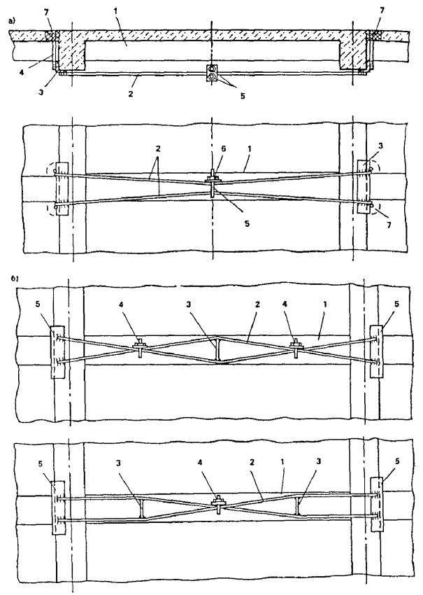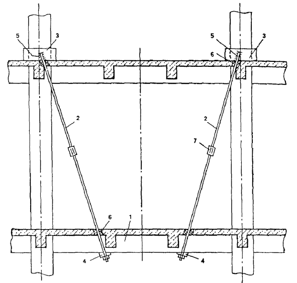 Рис. 24. Усиление изгибаемых элементов дополнительными упругими опорами а - металлическими балками на подвесках; б - металлическими треугольными фермами; 1 - разгружаемый элемент; 2 - разгружающая конструкция; 3 - подвеска; 4 - опора разгружающей конструкции; 5 - фиксирующий болт; 6 - прокладка; 7 - отверстия, заполняемые бетоном после усиления Рис. 25. Усиление дополнительной упругой опорой (предварительно напряженными тяжами) 1 - усиливаемый ригель; 2 - предварительно напряженный тяж; 3 - металлическая обойма; 4 - натяжная гайка; 5 - сварные швы; 6 - отверстия, заделываемые асфальтом; 7 - натяжная муфта 2.41. Опорные элементы кронштейна могут быть двух типов. При усилении сборных балок - это вертикальный металлический лист толщиной 20...30 мм и высотой 300...400 мм в пределах высоты балки, привариваемой внизу к распределительной горизонтальной прокладке. Опорный лист вставляется в зазор между сборными балками и передает нагрузку непосредственно на колонну, при этом необходимо обеспечивать возможность некоторого свободного поворота его, для чего зазор должен превышать толщину листа на 5...10 мм. При усилении второстепенных балок монолитных ребристых перекрытий опорные элементы выполняются в виде седлообразных накладок, устанавливаемых сверху на балки и связанных между собой сваркой (см. рис. 29). Рис. 26. Усиление рамы а - предварительно напряженными крестовыми связями: 1 - усиливаемые элементы рамы; 2 - металлическая обойма; 3 - предварительно напряженные тяжи; 4 - сварные швы; 5 - натяжная муфта; б - железобетонным раскосом с предварительно напряженными тяжами: 1 - элементы усиливаемой рамы; 2 - опорная накладка; 3 - предварительно напряженные тяжи; 4 - железобетонный раскос; 5 - металлическая обойма 2.42. Конструкция упорного устройства зависит от способа натяжения. При натяжении болтами она представляет собой жесткий элемент, пропускаемый под низом усиливаемой балки и закрепляемый на болтах к ветвям кронштейна (см. рис. 28). Контроль натяжения осуществляется по прогибу концов кронштейна. При натяжении подвеской оттарированного груза жесткий элемент упорного устройства приваривается к ветвям кронштейна, для чего в нем предусматриваются отверстия или привариваются петли. После натяжения в зазор между низом балки и пластиной упорного устройства плотно укладываются фиксирующие прокладки, а грузы снимаются. Потери напряжения устраняются подвеской груза на 10...15 % большего, чем требуемая разгружающая нагрузка. После натяжения домкратами, устанавливаемыми между упорами, подвешенными на концах кронштейна, и низом балки, также укладывают фиксирующие прокладки. Контроль натяжения осуществляют по манометру домкрата. Поскольку эта система является статически определимой, свободно вращающейся на средней опоре, то можно производить натяжение только одного конца кронштейна. Усилие на другом конце в этом случае будет также известно. Разгружающие кронштейны могут выполняться также в виде сплошных балок из прокатного металла (см. рис. 28). В случаях, если усиление вызвано нарушением анкеровки продольной рабочей арматуры, вынос опоры или кронштейна от опорного листа балки должен быть не менее 40 диаметров при стержневой арматуре периодического профиля и не менее 80 диаметров при арматуре из высокопрочной проволоки. 2.43. Конструкция кронштейнов, устанавливаемых на промеж