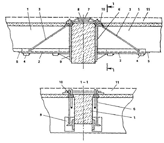 д - шпренгелем: 1 - усиливаемая балка; 2 - шпренгель; 3 - анкерное устройство; 4 - опорный швеллер; 5 - подкладка с шаровым гнездом; 6 - опорный лист; 7 - прокладка из круглых стержней; 8 - квадратная подкладка; 9 - гайка, вваренная в опорный лист; 10 - натяжной винт; 11 - пакет металлических прокладок На указанном примере натяжение шпренгелей и кронштейнов производится закручиванием гаек. 2.45. Для монолитных и сборных изгибаемых элементов в случаях необходимости проведения работ в минимальные сроки без снятия временной нагрузки может быть рекомендован способ усиления посредством установки дополнительной предварительно напряженной арматуры. Добавочная арматура может быть как горизонтальной, так и шпренгельной (рис. 30 - 35). Возможна также установка горизонтальной и шпренгельной арматуры одновременно. В результате установки дополнительной арматуры с предварительным ее напряжением меняется напряженно деформированное состояние усиливаемых балок. Предварительное напряжение включает дополнительную арматуру в совместную работу с усиливаемой балкой, которая может рассматриваться как изгибаемая конструкция с увеличенной площадью арматуры, дополнительная часть которой не имеет сцепления с бетоном, и с изменяющейся рабочей высотой. 2.46. Способ усиления установкой дополнительной предварительно напряженной арматуры имеет несколько разновидностей, которые отличаются друг от друга анкеровкой дополнительной арматуры и способом ее натяжения. Рис. 29. Усиление второстепенных балок предварительно напряженными разгружающими кронштейнами 1 - усиливаемая балка; 2 - уголки нижнего пояса кронштейна; 3 - тяжи кронштейна; 4 - соединительные планки; 5 - прокладка, устанавливаемая после напряжения кронштейна; 6 - подвески; 7 - стык тяжей; 8 - подкладка; 9 - опорные накладки; 10 - отверстия, заделываемые асфальтом; 11 - набетонка Натяжение дополнительной арматуры может производиться механическим, электротермическим или электротермомеханическим способами. При механическом способе натяжение напрягаемой арматуры производится с помощью домкратов, динамометрических ключей, натяжных болтов (см. рис. 28), стяжных хомутов, притягивающих тяжи друг к другу (см. рис. 31), а также специальных усиливающих устройств шпренгельного или рычажного типа (см. рис. 32 - 35).