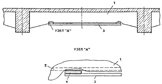 Рис. 30. Усиление балки дополнительной предварительно напряженной арматурой 1 - усиливаемая балка; 2 - арматура балки; 3 - дополнительная предварительно напряженная арматура; 4 - коротыш 2.47. Одним из способов закрепления дополнительной арматуры в случаях, когда анкерные устройства нельзя разместить на торцах балки, является их приварка к существующей арматуре (см. рис. 30). В этих случаях скалывают защитный слой на небольших участках в приопорных зонах, т.е. там, где напряжения в арматуре усиливаемой балки незначительны. К обнаженной рабочей арматуре необходимо приварить коротыши, диаметр которых несколько больше толщины защитного слоя, при этом не следует нарушать стержни поперечного армирования или хомуты. К коротышам приваривают арматурные стержни усиления. Натяжение в данном случае производят термическим способом. Стержни усиления устанавливают в проектном положении с помощью временных подвесок, количество которых следует назначать так, чтобы исключить провисание под действием собственного веса. Стержни должны быть максимально прямолинейными. Один конец стержня приваривают к коротышу, а второй остается свободным. Стержень включают в электрическую цепь и нагревают до расчетной температуры. Свободный конец прижимают к коротышу и приваривают. В процессе сварки до полного остывания шва необходимо поддерживать постоянную расчетную температуру. Для предотвращения выпучивания продольной арматуры в местах приварки дополнительной напряженной арматуры коротыши желательно располагать рядом с одним из хомутов со стороны пролета. 2.48. Прокладки, подкладки, и другие детали при усилении шпренгельной арматурой и ее натяжении (см. рис. 28) необходимо устанавливать в местах перегибов стержней между нижней гранью усиливаемой балки и шпренгельными стержнями. Конструкции этих элементов зависят от способа натяжения стержней, расстояния между нижней гранью усиливаемой балки и стержнями усиления и ширины усиливаемой балки.