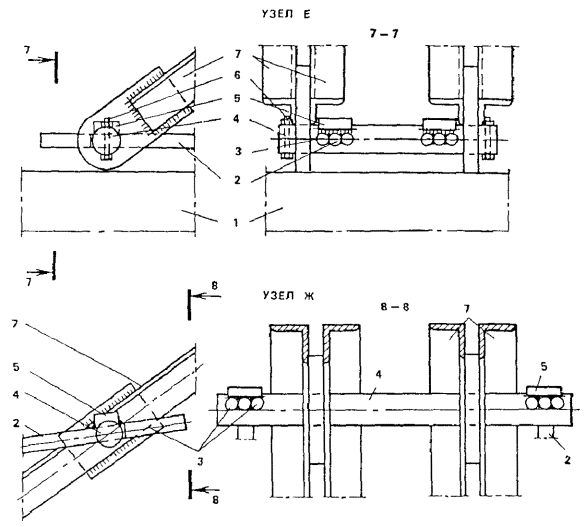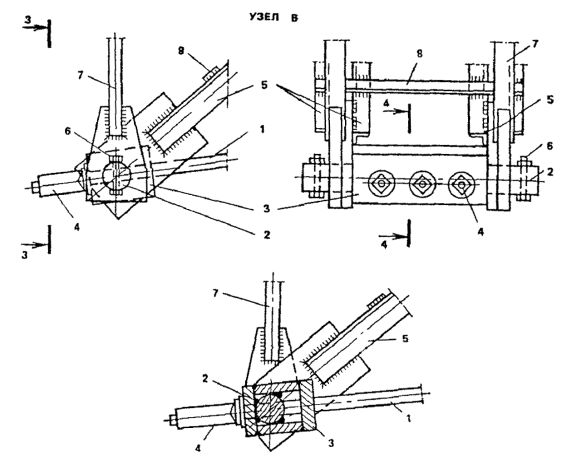 узел В: 1 - стержни затяжки; 2 - цилиндрический шарнир; 3 - короб усиления цилиндрического шарнира; 4 - анкер стержня затяжки типа «обжимная гильза»; 5 - рычаг; 6 - ограничительный болт; 7 - вертикальная тяга; 8 - соединительная планка;
