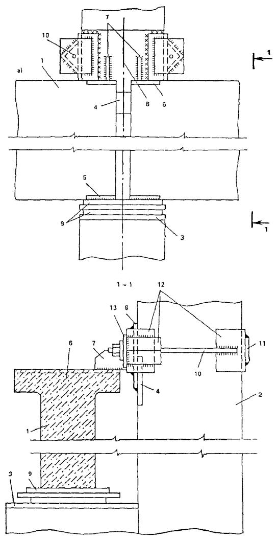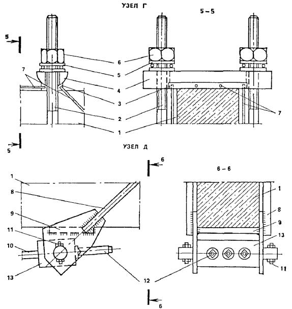 узлы Г и Д: 1 - усиливаемая конструкция; 2 - вертикальная тяга; 3 - подпятник шарнира; 4 - цилиндрический шарнир с пазами по торцам; 5 - упорный подшипник; 6 - гайка; 7 - монтажные связи; 8 - наклонные ветви опоры усиления; 9 - опорная подкладка; 10 - стержни затяжки; 11 - ограничительный болт; 12 - анкер стержня затяжки типа «обжатая гильза»; 13 - цилиндрический шарнир с коробом Устройство состоит из двух пар наклонных ветвей, которые верхними концами приварены к анкерным листам, а в нижней части имеют отверстия для шарниров; пары рычагов, которые соединены шарнирно с левой парой наклонных ветвей; горизонтальных затяжек, которые шарнирно закреплены на анкерах на одном конце с правой парой наклонных ветвей, а на другом - со свободными концами рычагов; пары вертикальных тяжей, шарнирно соединенных со свободными концами рычагов внизу и закрепляемых на усиливаемой конструкции вверху (натяжение и закрепление тяжей проще всего производится посредством закручивания гаек); монтажных связей из круглых стержней. Соединения и узлы усиливающего устройства см. на рис. 33 - 34. Короб усиления цилиндрического шарнира (см. рис. 33) может быть выполнен из уголка или листового металла. 2.51. Предварительное напряжение в затяжке достигается следующим образом: при закручивании гаек натяжного приспособления посредством пары тяжей свободные концы подтягиваются к нижней грани усиливаемой балки до горизонтального положения. В затяжке возникают растягивающие усилия и она включается в работу, разгружая усиливаемую балку. При усилении этим способом можно натягивать любое необходимое количество стержней. Как правило, усилие натяжения в вертикальных тяжах составляет не более 15 % требуемого усилия натяжения в затяжке и зависит от угла наклона рычагов к нижней плоскости усиливаемой балки, а также от места закрепления затяжек на рычагах. При закреплении затяжек в средней части рычагов усилие натяжения в вертикальных тяжах снижается прямо пропорционально отношению полной длины рычагов к расстоянию до места закрепления затяжек на рычагах. 2.52. Указанное усиливающее устройство может быть использовано при усилении многопролетных балок (см. рис. 32). В этом случае стержни затяжек соединяются между собой в непрерывную цепь, в которую включены рычаги, располагаемые на верхней плоскости балок. В местах перегибов стержней затяжек устанавливаются опорные прокладки, располагаемые по верхней и нижней плоскостям усиливаемых многопролетных балок. Затяжки с одной стороны заанкериваются на неподвижном шарнире рычагов, а с другой - в средней части рычагов. 2.53. Натяжение затяжек для многопролетных балок производится так же, как и для однопролетных посредством закручивания гаек на вертикальных тяжах. Поскольку в данном случае рычаги располагаются на верхней плоскости балок, то натяжные приспособления следует располагать под нижней плоскостью. Рычаги после натяжения (когда они принимают горизонтальное положение) закрепляются на стержнях затяжек посредством привариваемых к ним накладок из листового металла (см. рис. 34). 2.54. В качестве глухих анкеров для арматурных канатов классов К-7 и К-19, а также для стержневой арматуры с плохой свариваемостью рекомендуются анкеры типа «обжатая гильза». Для стержневой арматуры классов A-IV (марка 20 ХГ2Ц) и А-V рекомендуются анкеры двух типов: высаженны