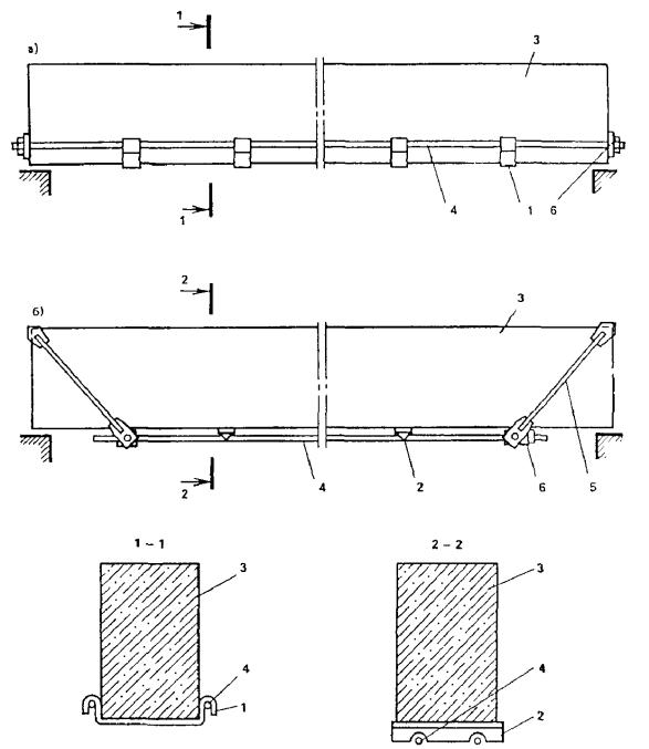 г - подпружными системами: I - крайних пролетов - шпренгелем; II - средних пролетов - разгружающими кронштейнами; 1 - усиливаемая балка; 2 - опора; 3 - шпренгель; 4 - упоры; 5 - уголок; 6 - соединительная стяжка;