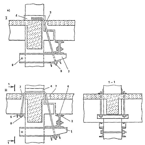 в - металлическими приспособлениями: I - закрепленными на колонне; II - закрепленными на балке; 1 - подвесная консоль; 2 - подпорка; 3 - несущий хомут; 4 - металлическая обойма; 5 - шайба-упор; 6 - подкладка; 7 - отверстие, заделываемое после установки приспособления; 8 - гайка; 9 - стяжной болт;