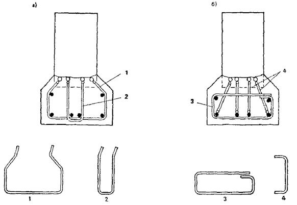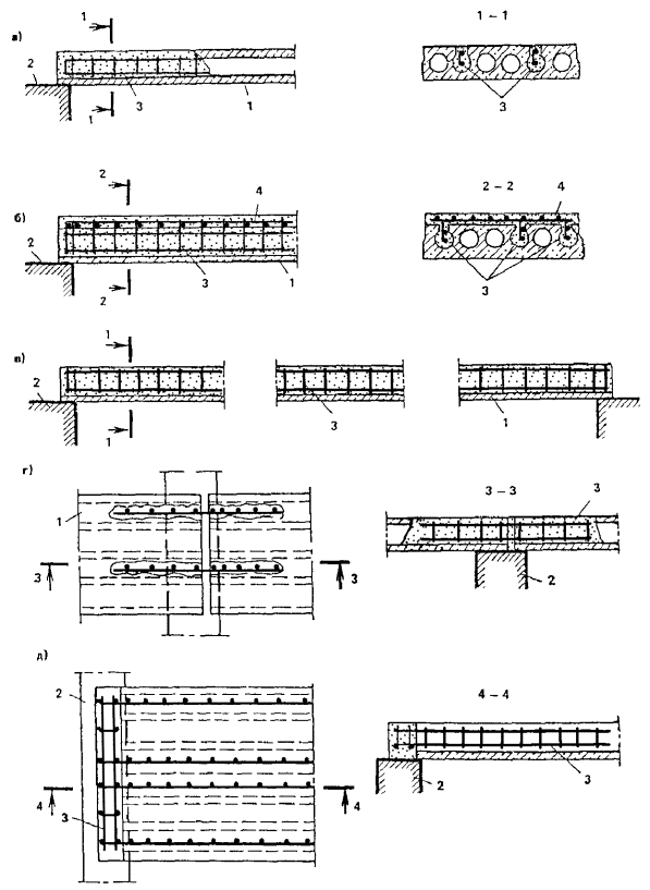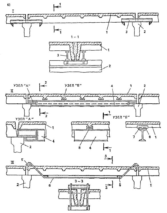 Рис. 47. Усиление сборных ребристых плит а - выносными опорами: 1 - ферма; 2 - усиливаемая плита; 3 - металлические балки; 4 - металлические консоли; 5 - упоры; 6 - клиновидные подкладки; б - подведенными элементами: I - уменьшением пролета выносными опорами на двухконсольных подпружных балочках; II - подведением стальных балок, подклиненных к поперечным ребрам (правое нижнее изображение - сечение 2 - 2); III - шпренгелем; 1 - усиливаемая плита; 2 - опора; 3 - подпружная балочка; 4 - стальная балка; 5 - опорные и подкладные детали; 6 - шпренгель; 7 - подкладка из швеллера; 8 - клиновидные прокладки; в - при недостаточной площади опирания: I - на средних опорах; II - на крайних опорах; 1 - опора; 2 - усиливаемая плита; 3 - металлические балки усиления; 4 - поперечная траверса; 5 - уголки анкера; 6 - болты анкера В случае, когда требуется одновременное усиление на поперечную силу и изгибающий момент, отверстия пробиваются и бетонируются по всей длине усиливаемых плит (см. рис. 46). 2.91. При недостаточной площади опирания пустотных плит на промежуточных опорах пробиваются до пустот отверстия в приопорных зонах, в пустоты плит смежных пролетов заводятся общие арматурные каркасы, объединяющие плиты, после чего производится общее для смежных плит бетонирование пустот (см. рис. 46). Усиление в этом случае достигается также за счет создания неразрезных плит. 2.92. При недостаточной площади опирания пустотных плит на крайние опоры рекомендуется устанавливать на них арматурные каркасы так, чтобы они выходили за торцы плит (размеры выпусков и каркасов зависят от ширины опоры). После установки дополнительных каркасов в поперечном направлении (параллельно торцам плит) бетонируется балка, которая служит анкером для выпусков каркасов плит (см. рис. 46). Все работы по установке каркасов в пустоты плит следует производить согласно п. 3.90. 2.93. Усиление сборных ребристых плит можно производить несколькими способами: выносными металлическими опорами; подведенными металлическими балками, подклиненными к ребрам, а также шпренгелями (рис. 47). При производстве работ по включению выносных опор в работу (см. рис. 47) для недопущения отрыва или подъема плит величина усилий не должна превышать собственного веса конструкций и прочности их крепления к опорам. 2.94. При недостаточной площади опирания ребристых сборных плит рекомендуется устройство дополнительных металлических опорных элементов. На промежуточных опорах дополнительные опорные элементы выступают в обе стороны от опоры и являются общими для плит смежных пролетов (см. рис. 47). На крайних опорах дополнительные опорные элементы выступают в одну сторону, имеют больший вылет и притягиваются к плите болтами (см. рис. 47). Продольные ребра смежных плит опираются на общую траверсу дополнительных опорных элементов. 2.95. Усиление ребер сборных плит покрытий рекомендуется осуществлять одним из следующих способов. Усиление на воздействие изгибающих моментов осуществляется бетонированием швов между плитами с установкой в них арматурных каркасов, т.е. созданием дополнительной балочки с одновременным наращиванием сверху или без него, а также односторонним наращиванием снизу с установкой дополнительной арматуры, привариваемой к существующей через коротыши (рис. 48). Рис. 48. Усиление ребер сборных плит а - бетонированием шва между плитами; б - односторонним н