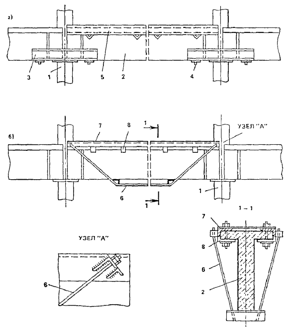 Рис. 22. Усиление ригеля дополнительной жесткой опорой а - опирающимися на нижележащее перекрытие: 1 - усиливаемый ригель; 2 - подкладка; 3 - коротыши из круглых арматурных стержней; 4 - двухсторонняя распорка, привариваемая после распора полураскосов; 5 - металлический оголовник; 6 - полураскос; 7 - затяжка на уровне пола; 8 - домкрат; 9 - сварные швы; б - опирающимися на обоймы колонны: 1 - усиливаемый ригель; 2 - обойма; 3 - подкосы; 4 - затяжка; 5 - натяжная муфта; 6 - металлический оголовник; 7 - планки; 8 - прокладки 2.39. Для основного натяжения ветвей цепи в месте расположения центральной подвески или стойки применяются различные способы. В случаях, когда цепь располагается выше низа усиливаемой балки, т.е. требуется установка подвески, натяжение можно осуществлять посредством закручивания гаек динамометрическим ключом с помощью домкрата с манометром, упирающегося в низ балки, и другими способами. Показания манометра позволяют достаточно точно определять величину разгружающей нагрузки. Независимо от расположения цепи относительно усиливаемой балки можно осуществить натяжение ее ветвей оттарированным грузом с последующей фиксацией узла подвеской или стойкой. При натяжении этим способом также обеспечивается достаточный контроль. 2.40. Для усиления изгибаемых элементов многопролетных зданий или конструкций (сборных балок покрытия, второстепенных балок монолитных ребристых перекрытий и т.п.) в приопорных зонах могут применяться двухконсольные предварительно напряженные разгружающие кронштейны, устанавливаемые на промежуточных опорах (рис. 29). Рис. 23. Усиление дополнительной упругой опорой (металлической балкой) а - на подвесках - стяжных болтах: 1 - усиливаемая балка; 2 - усиливающая балка; 3 - стяжной болт; 4 - опорный уголок; 5 - прокладка; б - на кронштейнах; 1 - усиливаемая балка; 2 - усиливающая балка; 3 - металлическая обойма колонны; 4 - кронштейны; 5 - клиновидные прокладки При усилении сборных балок покрытия обе ветви кронштейнов представляют собой треугольные фермы. Нижний пояс выполняется из одного уголка, а верхний пояс и решетка могут быть выполнены как из одинарных уголков, так и из круглых арматурных стержней (см. рис. 28). Высота кронштейнов принимается равной высоте надопорной части усиливаемых балок. Длины консольных частей кронштейнов рекомендуется принимать равными 1/4 - 1/6 пролета усиливаемых балок. При небольшой длине консольных частей можно вообще отказаться от внутренних элементов решетки. Частями кронштейна являются ветви кронштейнов, опорные элементы (опорный лист или седлообразные накладки), соединительные элементы в виде отрезков уголков или круглых стержней, упорные устройства, прикрепляемые под низом усиливаемой балки к концам ветвей кронштейна. Эти устройства служат для создания опор усиливаемых балок и могут иметь различную конструкцию в зависимости от способа натяжения кронштейна.