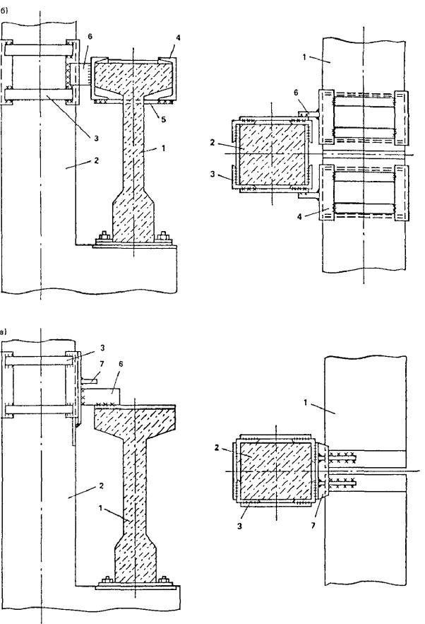 Рис. 53. Усиление крепления подкрановой балки к колонне а - приваркой закладных деталей балки к элементам хомута колонны: 1 - подкрановая балка; 2 - колонна; 3, 4 - закладные детали колонны; 5, 6 - закладные детали подкрановой балки; 7 - пластина крепления; 8 - уширение закладной детали; 9 - выравнивающие подкладки; 10 - тяж; 11 - соединительная планка; 12 - подкладки из уголков; 13 - пружинная шайба; б - приваркой металлической обоймы полки к элементам обоймы колонны; в - приваркой закладных деталей балки к элементам обоймы колонны; 1 - подкрановая балка; 2 - колонна; 3 - обойма колонны; 4 - обойма полки балки; 5 - стяжные болты; 6 - лист крепления; 7 - ребро жесткости обоймы колонны 2.103. При легком режиме работы кранов могут быть рекомендованы более простые конструктивные решения креплений подкрановых балок к колоннам (см. рис. 53). От усиления, предлагаемого в п. 2.102, они отличаются большей жесткостью и менее эффективны при работе на выносливость. Особенности усиления хранилищ для сыпучих материалов2.104. Усиление стен хранилищ для сыпучих материалов без изменения статической схемы и напряженного состояния может выполняться: с внешней стороны - стальными и железобетонными бандажами и обоймами (рис. 54); с внутренней стороны - железобетонными и стальными гильзами; на отдельных участках по высоте - местными железобетонными обоймами. 2.105. Стальные бандажи могут устанавливаться с зазором между ними и стеной или без зазора. Бандажи без зазора выполняются из стальной полосы, охватывающей стену по всему периметру, и имеют в месте замыкания стяжные болты. Для обеспечения надежной совместной работы бандажей со стеной целесообразно предусматривать их предварительное напряжение. Плотность примыкания бандажей к стене контролируется простукиванием по всей их длине. В местах, где обнаружено неплотное примыкание, производится зачеканка цементным раствором. При устройстве бандажа с зазором (например, при наличии на поверхности стены выступов и впадин) плотность примыкания обеспечивается зачеканкой зазора или заливкой в него раствора. Для этого конструкция бандажа включает приваренный по всему периметру в нижней его части стержень диаметром, равным заданному зазору. В верхней части полосы привариваются коротыши такого же диаметра с промежутками между ними для зачеканки или заливки раствора (см. рис. 54). 2.106. Монтаж бандажей целесообразно выполнять сверху вниз, при этом закрепленные бандажи можно использовать в качества конструкций, поддерживающих подмости и люльки, необходимые при монтаже нижерасположенных бандажей. При устройстве стальных рубашек с последующей зачеканкой или заливкой бетоном зазора монтаж целесообразно выполнять отдельными кольцами по высоте снизу вверх. Каждый очередной ярус рубашки монтируется после заполнения зазора предыдущего яруса. 2.107. Усиление стен на отдельных участках по высоте целесообразно выполнять путем устройства железобетонных обойм, как правило, с однорядным армированием. При их применении обеспечивается совместная работа стен и обойм на растяжение. 2.108. Разновидностью железобетонных обойм являются обоймы с предварительно напряженной горизонтальной несущей арматурой. По высоте стен для рассматриваемого варианта усиления вертикально устанавливают прокатные профили (швеллеры, двутавры и др.) с отверстиями, через которые 