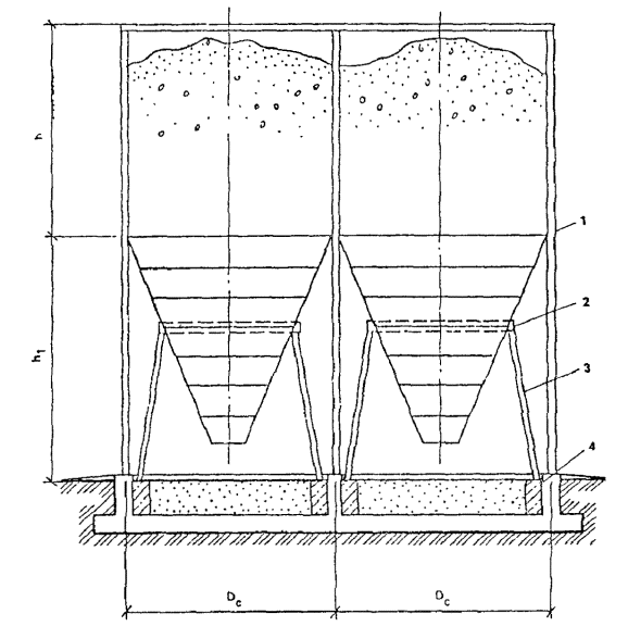 где li - длина звена цепи. 3.86. Расчет ферм, усиленных цепями, рекомендуется проводить по аналогии с расчетом балок, но значения Fsus в этом случае подбираются по разности возникающих в элементах фермы усилий (сжимающих, растягивающих) от действия на ферму полной нагрузки и усилий, воспринимаемых ею без усиления цепью. При проектировании следует учитывать, что силы Fsus, прикладываемые к узлам нижнего пояса, в ряде случаев могут не уменьшать, а увеличивать первоначальные усилия в отдельных стержнях. Поэтому при усилении ферм цепями для отдельных элементов может потребоваться их усиление (обоймами, затяжками и пр.) в соответствии с приращениями усилий от сил, прикладываемых в узлах (табл. 3). Особенности расчета усиления хранилищ для сыпучих материалов3.87. Расчет усиления стен хранилищ сыпучего материала выполняется в зависимости от конструктивного решения самой емкости, схемы усиления, статической схемы конструкции после усиления. При этом рассматриваются емкости прямоугольного и круглого в плане сечения. 3.88. При усилении стен прямоугольных в плане емкостей наращиванием, внутренними гильзами или наружными железобетонными рубашками в расчетах на изгиб учитывается жесткость в виде суммы жесткостей старого и нового сечений в том случае, если не предусматриваются специальные мероприятия по обеспечению совместной работы составного сечения по поверхности контакта старого и нового бетона. Если такие мероприятия предусмотрены, а их эффективность может быть оценена расчетным путем, жесткость можно принимать как для общего сечения h1 + h2, где h1 - высота сечения бетона усиливаемой стены; h2 - высота сечения наращивания. 3.89. При усилении наращиванием круглых и прямоугольных в плане емкостей (внутренних гильз или наружных рубашек) на восприятие вертикальных сжимающих нагрузок в расчете по первому предельному состоянию необходимо учитывать полное сечение в виде суммы сечений усиливаемой конструкции и наращивания. При этом длина зоны должна обеспечить передачу сдвигающих напряжений с усиливаемой конструкции на элементы усиления и наоборот. 3.90. При расчете усиления прямоугольных в плане емкостей тяжами, диафрагмами или перегородками последние учитываются как несмещаемые опоры. Расчетная схема стены устанавливается в зависимости от конструкции примыкания элемента усиления к стене. 3.91. Горизонтальную нагрузку от сыпучего материала на стены емкостей при усилении перегородками и диафрагмами определяют в соответствии с указаниями СНиП 2.09.03-85 и с учетом фактического после усиления гидравлического радиуса сечения емкости. При этом вертикальная нагрузка сверху и снизу сечения диафрагм определяется согласно соотношению геометрических размеров емкостей (силосных или бункерных). 3.92. При усилении горизонтальными перфорированными диафрагмами горизонтальную нагрузку на стены определяют и пределах высоты, равной расстоянию между диафрагмам) по схеме работы бункеров. Вертикальную нагрузку на стены емкостей определяют по полной массе сыпучего материала. 3.93. При усилении экраны, подвешенные с зазором к стене, рассчитывают только на вертикальную нагрузку. Если экраны опираются на колонны, стены на сжатие не работают, нагрузка от экранов передается через колонны на плиту подсилосного этажа или на обвязочную балку. 3.94. Расчет усиления кр