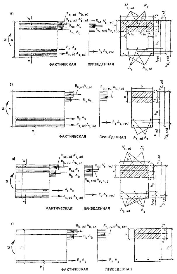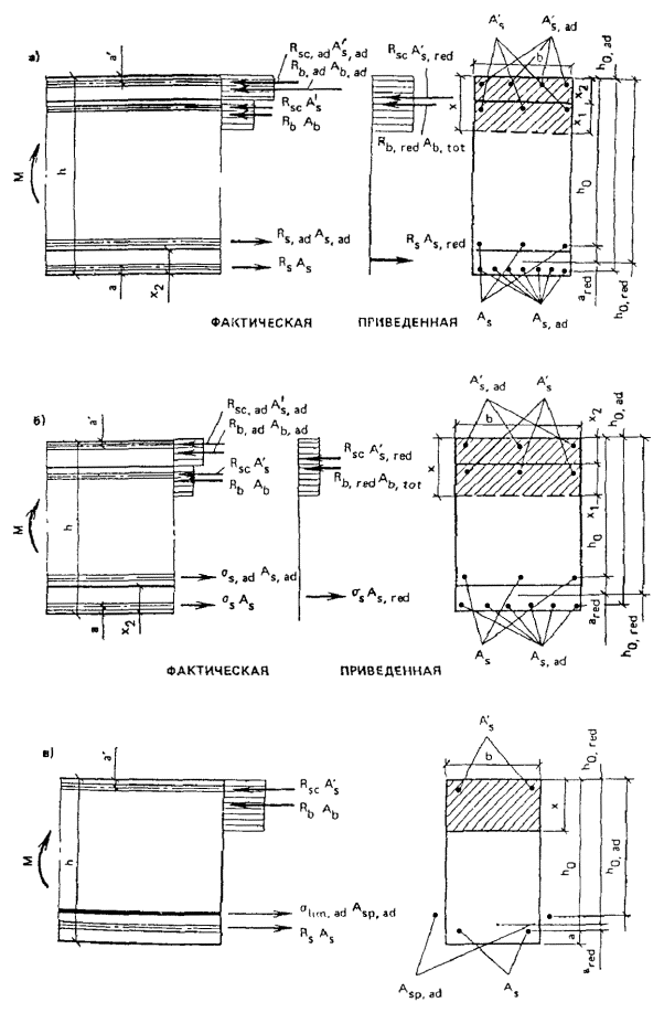 где w = a - 0,008 Rb по формуле (26) СНиП 2.03.01-84*. Коэффициент a = 0,85 для тяжелого бетона; ssr = Rs = 280 МПа, ssc,u = 400 МПа. Рис. 69. Схемы усилий и эпюры напряжений в сечении, нормальном к продольной оси изгибаемого элемента а - усиленного двухсторонним наращиванием при условии ξ < ξR; б - то же, при условии ξ > ξR; в - усиленного предварительно напряженной арматурой без сцепления с бетоном