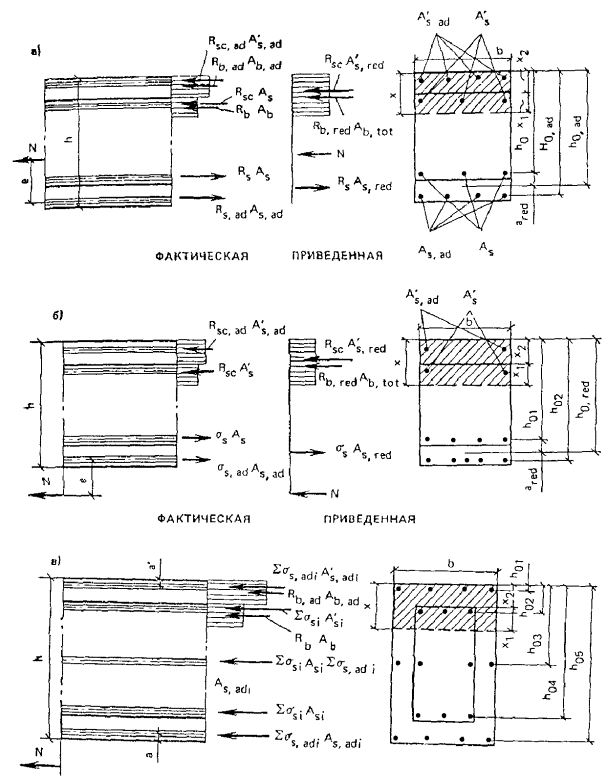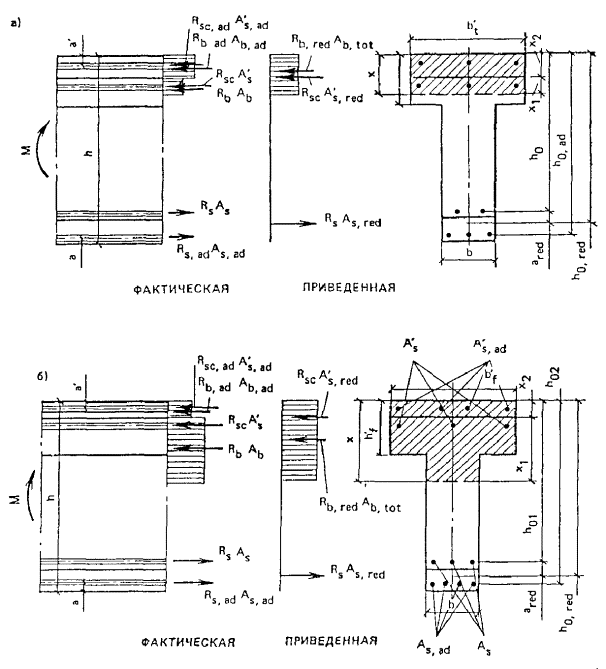 х = (1,145 · 1069 · 1,812 · 10-4 + 365 · 4,02 · 10-4 - 365 · 1,57 · 10-4) / (27,5 · 0,18) = 0,063 м. Находим несущую способность усиленного элемента M по формуле (9) Рекомендаций М = 27,5 · 0,18 · 0,063 (0,269 - 0,5 · 0,065) + 365 · 1,57 · 10-4 ´ ´ (0,269 - 0,025) = 0,0881 МПа·м3 = 88,1 кНм. Усиление внецентренно сжатых элементовПример 7. Дано: размеры сечения усиленного элемента b = 0,6 м; h = 0,9 м; бетон усиливаемого элемента условного класса В′12,5; Rb = 7,5 МПа; высота наращивания х2 = 0,15 м; бетон усиления класса В20; Rb,ad = 15 МПа. Расположение арматуры показано в сечении на рис. 70. h0 = 0,72 м; h0,ad = 0,87 м; а = а′ = 0,03 м; арматура усиливаемого элемента вида А-II, Rs = Rsc = 280 МПа; As = 12,568 · 10-4 м2 (4 Ø 20); A′s = 9,426 · 10-4 м2 (3 Ø 20); арматура усиливающего элемента вида А-III, Rs,ad = Rsc,ad = 365 МПа; As,ad = 26,545 · 10-4 м2 (5 Ø 26); A′s,ad = 21,236 · 10-4 м2 (4 Ø 26). Внецентренная нагрузка на элемент N = 1000 кН = 1 МН. Усиление железобетонного элемента осуществлялось при первоначальном его загружении, превышающем 65 % разрушающей нагрузки. Следовательно, согласно п. 3.13 Рекомендаций коэффициент условий работы усиленной конструкции gbr1 = gsr1 = 0,8. Расчет. По формуле (5) определяем As,red As,red = 12,558 · 10-4 + Рис. 70. Схемы усилий и эпюры напряжений в сечении, нормальном к продольной оси внецентренно сжатого элемента, усиленного двухсторонним наращиванием, при расчете его по прочности По формуле (6) определяем A′s,red A′s,red = 9,426 · 10-4 + Находим по формуле (7) аred аred = [365 · 26,545 · 10-4 (0,87 - 0,72)] / (0,8 · 280 · 12,568 · 10-4 + + 365 · 26,545 · 10-4) = 0,12 м. Определим расстояние h0,red от сжатой грани усиленного элемента до общего центра тяжести растянутой арматуры по формуле (4) h0,red = 0,72 + 0,12 = 0,84 м. По формуле (8) определяем относительную высоту сжатой зоны бетона ξ, при этом Rb принимаем согласно положениям п. 3.30 Рекомендаций ξ = (0,8 · 280 · 47,17 · 10-4 - 0,8 · 280 · 44,03 · 10-4) / (0,8 ´ 15 · 0,6 · 0,84) = 0,01. По СНиП 2.03.01-84* определяем ξR