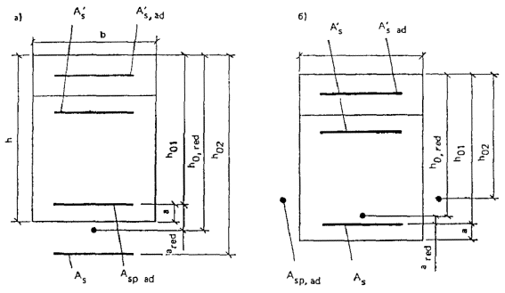 где Es - модуль упругости арматуры усиливаемого элемента. При этом необходимо исключать участок малых уклонов i £ 0,01, при которых изменение уклонов вызывает малые напряжения, компенсирующие первоначальное выпрямление стержней. 3.41. Определение несущей способности по нормальным сечениям изгибаемых элементов, усиленных предварительно напряженными стержнями, не имеющими сцепления с бетоном, рекомендуется выполнять в соответствии со СНиП 2.03.01-84* с учетом пп. 3.29, 3.30, 3.42, 3.43 настоящих Рекомендаций. 3.42. Если внешняя сила действует в плоскости оси симметрии сечения, то определение несущей способности изгибаемых элементов, усиленных предварительно напряженными горизонтальными стержнями, допускается выполнять в зависимости от соотношения между величиной относительной высоты сжатой зоны бетона ξ, определяемой из соответствующих условий равновесия, и граничного значения относительной высоты сжатой зоны бетона ξR, при которой предельное состояние наступает одновременно с достижением в растянутой арматуре S усиливаемого элемента - напряжения, равного расчетному сопротивлению Rs, а в арматуре усиления напряжения, определяемого по формуле где a = Еs / Еb; Еb - модуль упругости бетона усиливаемого элемента; ssp,ad - задаваемая величина предварительного напряжения в дополнительной арматуре усиления (с учетом потерь); Rs,ser,ad - расчетное сопротивление дополнительной арматуры усиления для предельных состояний второй группы, МПа; gs - коэффициент надежности по арматуре, определяемый по СНиП 2.03.01-84*; μ - коэффициент армирования, определяемый из отношения суммарной площади усиливаемой Аs и усиливающей арматуры Аsp,ad к площади бетона, вычисленной из произведения ширины усиливаемого элемента b на расстояние от сжатой грани усиленного элемента до центра тяжести растянутой арматуры h0; l - расстояние между внутренними торцами анкеров арматуры усиления, м; δb - основной безразмерный коэффициент, определяемый по формуле δb = [(δa Es,ad As) / (Rs,ser,ad Es,st Asp,ad)] - δcl + 1,3, (32) где δa - вспомогательный коэффициент, принимаемый равным 820 МПа; Es,ad - модуль упругости дополнительной арматуры усиления; Es,st - модуль упругости арматуры класса К-7, принимаемой за эталон, равный 1,8 · 105 МПа; Asp,ad - площадь дополнительной напрягаемой арматуры усиления; δcl - коэффициент, учитывающий отсутствие контакта арматуры усиления с усиливаемой конструкцией и равный 0,55 (при наличии контакта равен нулю). При этом slim,ad для высокопрочной проволочной арматуры принимается не выше ее расчетного сопротивления согласно СНиП 2.03.01-84*. При определении граничной относительной высоты сжатой зоны бетона ξR по СНиП 2.03.01-84* напряжения в растянутой арматуре следует принимать по арматуре с более высоким расчетным сопротивлением (по арматуре усиливаемого элемента либо по дополнительной напрягаемой арматуре усиления). Расчетная схема усиления изгибаемого элемента напрягаемой арматурой без сцепления с бетоном в растянутой зоне при одновременном усилении сжатой зоны приведена на рис. 60. 3.43. При проектировании изгибаемых элементов, усиленных предварительно напрягаемой арматурой, следует соблюдать условие ξ £ ξR, ограничивающее относительную высоту сжатой зоны бетона. Проектирование изгибаемых элементов с усилением предварительно напрягаемой арматурой (затяжками) без соблюдения указанного условия не рекомендуется
