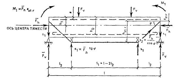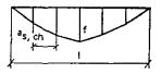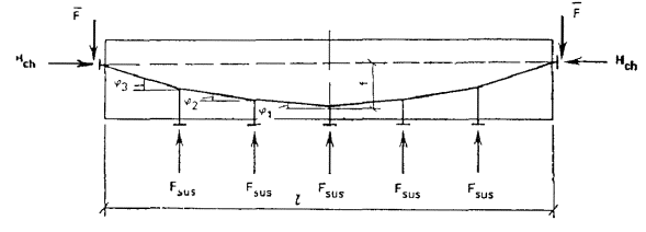 где Nt - усилие в растянутом раскосе; δ1 = ss / 196, где ss - напряжение в существующей арматуре раскоса от действия расчетной нагрузки, уменьшенное на величину 196 МПа; δ2 - коэффициент, учитывающий возможное увеличение заделки стержня а3 в сжатой зоне (для узлов со сжатой стойкой и растянутыми раскосами принимается равным 1,1, для всех остальных случаев - равным 1); d - диаметр продольной арматуры раскоса, м; b - угол между поясом и растянутым раскосом (см. рис. 67); Asw1 - площадь сечения одного поперечного стержня; Rsw - расчетное сопротивление поперечной арматуры; пAB - число поперечных стержней, пересекаемых линией АВ (см. рис. 67), исключая стержни, расположенные ближе 100 мм к точке А. Особенности расчета усиления балок и ферм предварительно напряженными шарнирно-стержневыми цепями3.83. Конструкции, усиленные предварительно напряженными шарнирно-стержневыми цепями, рекомендуется рассматривать как комбинированные статически неопределимые системы. Допускается их расчет по упрощенному методу, приведенному в пп. 3.84 - 3.86. 3.84. Натяжение цепи рекомендуется осуществлять при действии на усиливаемую конструкцию не менее 70 - 80 % полной нагрузки. При проектировании усиления цепью стрелу прогиба цепи f рекомендуется принимать максимальной с учетом допускаемых габаритов, а количество узлов равным трем, пяти или семи. Распор цепи Hch рекомендуется передавать на усиливаемую балку ниже центра тяжести приведенного сечения или не выше верхней границы ядра этого сечения. 3.85. При расчете усиления по упрощенному методу рекомендуется: определить необходимую степень разгружения балки; наметить очертание цепи; установить усилия в подвесках (стойках) Fsus (рис. 68) и вычислить первоначальную длину цепи Lch; по известным усилиям в подвесках определить усилие во всех звеньях цепи и подобрать их сечение; учитывая деформации цепи, откорректировать расчет и наметить положение цепи после натяжения. Необходимую степень разгружения конструкции определяют из условия прочности. Рис. 68. Схема расчета балки, усиленной предварительно напряженной шарнирно-стержневой цепью Для балок значения изгибающего момента Mch и поперечной силы Qсh, возникающих в них от натяжения цепи, определяют по формулам: Mch = Mtot - Mmax; (88) Qch = Qtot - Qmax, (89) где Mtot и Qtot - соответственно полный момент и поперечная сила; Mmax и Qmax - максимально воспринимаемые сечением без усиления момент и поперечная сила. Неизвестные усилия в подвесках цепи Fsus рассматриваются как внешняя нагрузка, приложенная к балке снизу вверх. Внешние усилия Fsus будут одинаковыми во всех подвесках цепи в том случае, если будут соблюдаться рекомендуемые в п. 2.38 тангенсы углов наклона звеньев цепи. Эта нагрузка должна создавать изгибающий момент и поперечную силу, которые в соответствующих расчетных сечениях равны Mch и Qсh. Из полученных с учетом Mch и Qсh двух значений Fsus принимают большее. По Fsus находят распор цепи Нch, т.е. продольную силу сжатия (см. рис. 68). Далее необходимо проверить прочность сечений балки как внецентренно сжатого элемента с учетом силы Hch по СНиП 2.03.01-84*. Если увеличенная высота сжатой зоны бетона х = (Rs As + Hch) / (Rb b) в результате действия продольной силы N = Hch xmax, проверку сечения можно не делать. Если до усиления высота сжатой зоны х ³ хтах, то значение усилия в подвеске Fsus находят путем последовательных приближений. В первом приближении Fsus реком