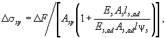 где l - длина усиливаемого элемента; F - внешняя нагрузка на элемент; Nad - усилие, воспринимаемое дополнительной арматурой (затяжкой); N0 - усилие обжатия элемента в момент приложения эксплуатационной нагрузки; Ared = (Еs Аb) / Еb - площадь приведенного сечения в соответствии с главой СНиП 2.03.01-84*; ψs - коэффициент, учитывающий работу бетона между трещинами и определяемый по СНиП 2.03.01-84*. 3.71. Величина оптимального предварительного напряжения в затяжке ssp определяется с учетом приращения напряжения при изменении внешней нагрузки и потерь напряжений в затяжках ssp = Rs - Dssp + sl,sp £ 0,9 Rs, (68) где Dssp - приращение напряжения в затяжке при изменении нагрузки; sl,sp - потери напряжения в затяжке. Величина Dssp определяется по формулам: а) для элементов без трещин